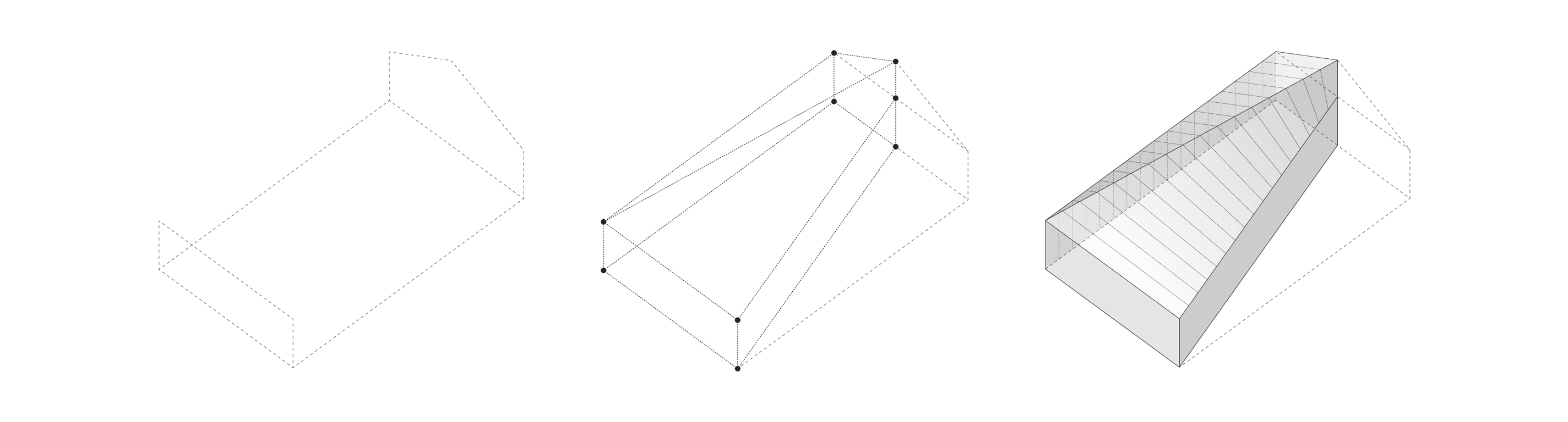 In a gesture that is both singular and complex, the new form negotiates three primary constraints: the gable profile of the existing roof; the provision of light, air and views to the interior; and the rescode envelope along the south boundary. This negotiation results in a set of ruled and planar surfaces that transform along the length of the plan from a skillion roof profile on one end, to a flat roof profile on the other.