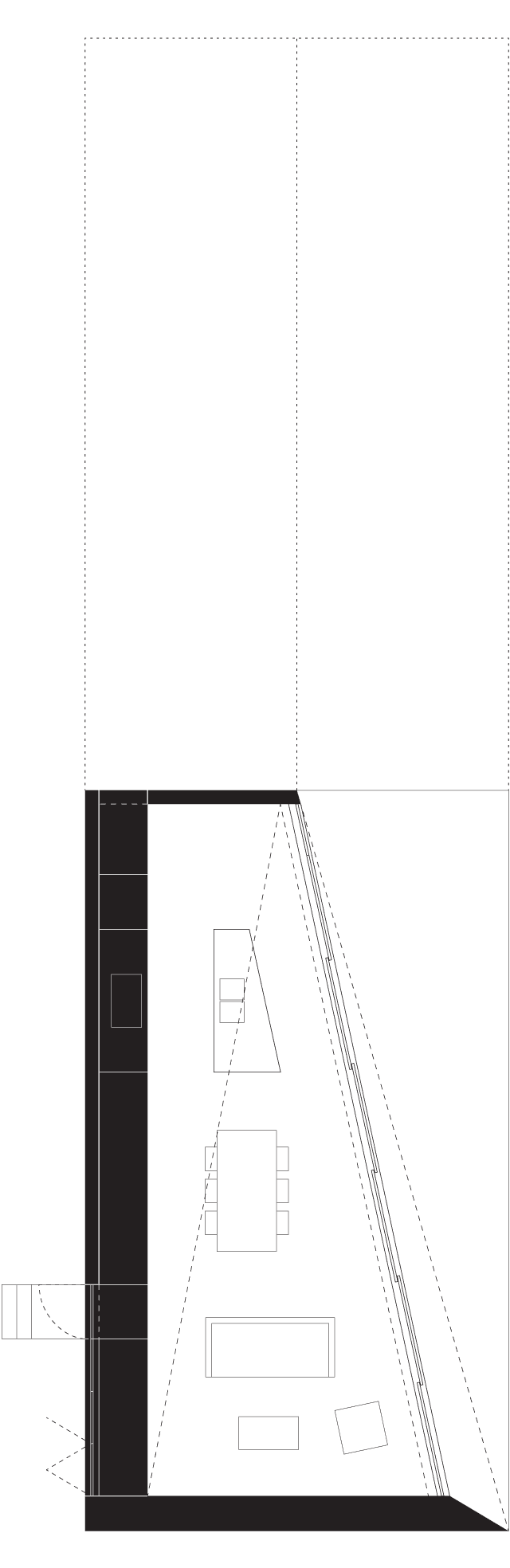 The figure of the plan is defined by an oblique glazed wall, which pivots from the existing ridgeline. In so doing, it addresses the difficult orientation of the property, opening up the interior to northeast light. Internally, the shifting form of the ceiling works in parallel with the geometry of the plan offering spatial definition to an otherwise open volume.