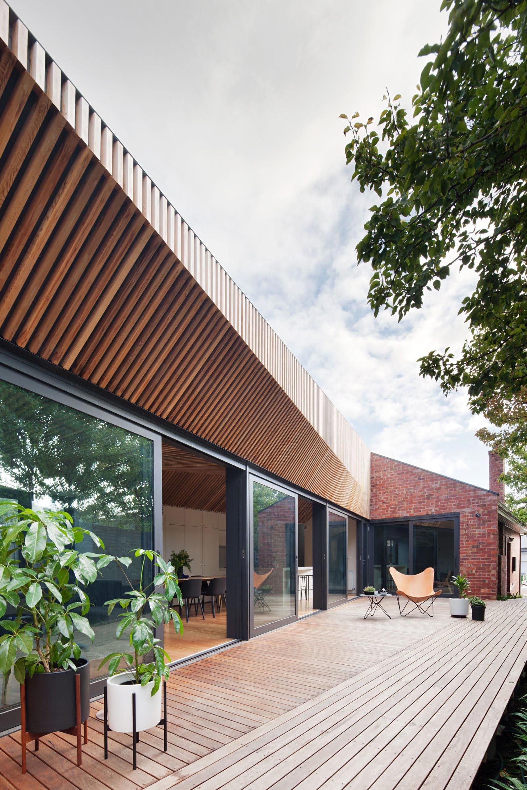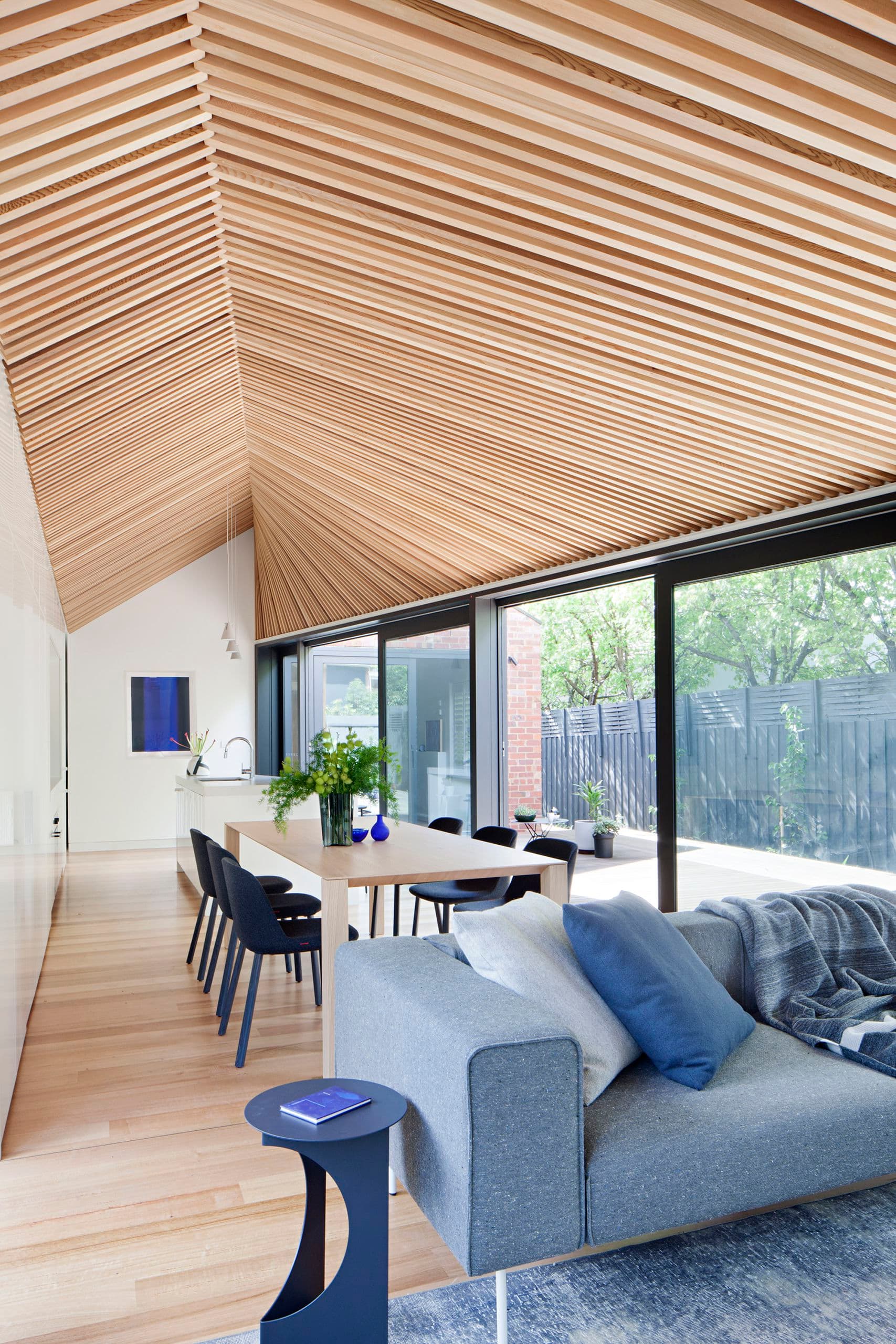 The apex and pitch of the skillion profile align perfectly with the existing gable, establishing a series of datum from which the formal shifts of the intervention unfold. Whilst unashamedly contemporary, the new form takes its cue from the immediate context and appears to emerge out of the existing house. This dynamic adjacency of old and new offers a deliberate counterpoint to many backyard renovations, where an undifferentiated box abuts an existing pitched roof dwelling.