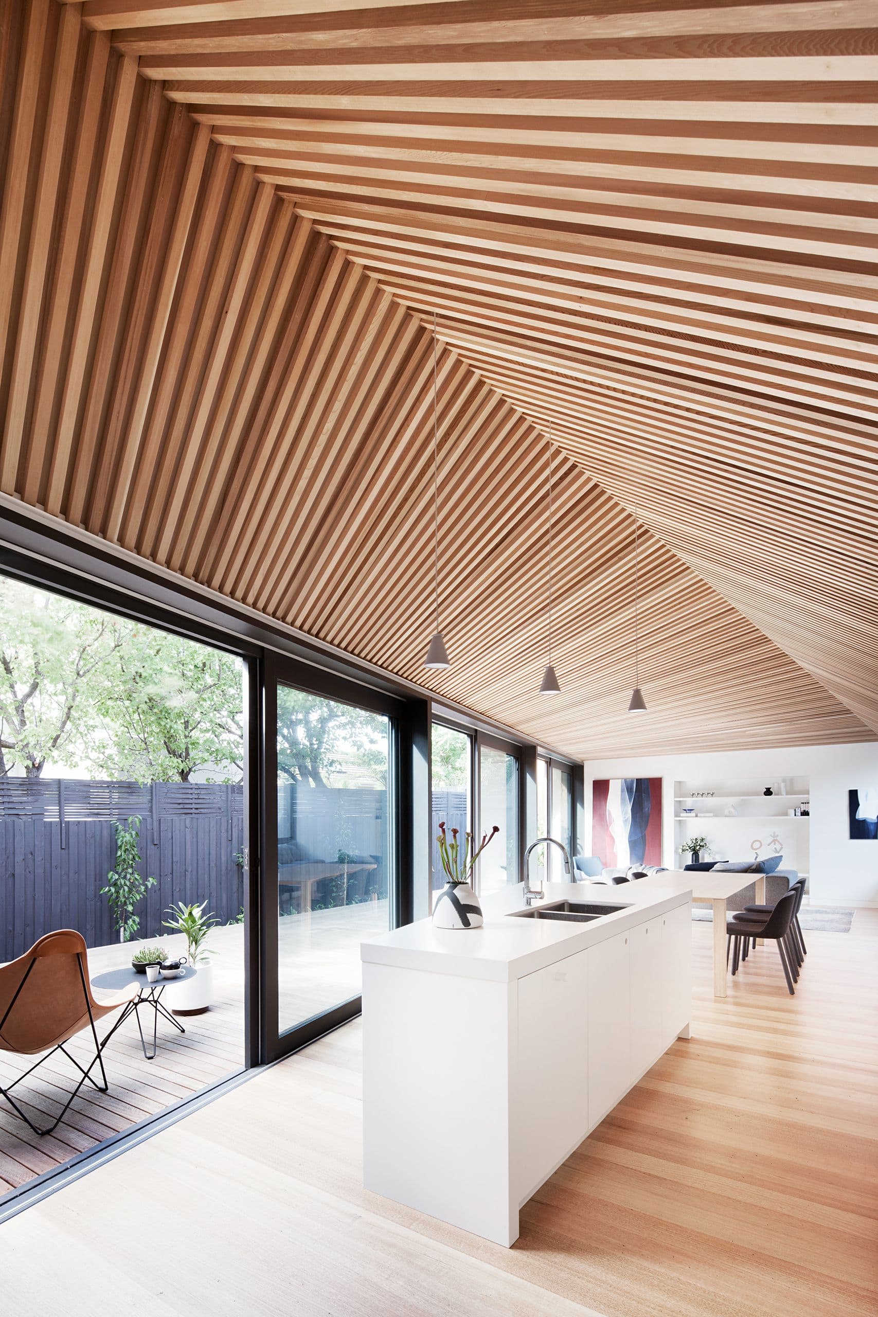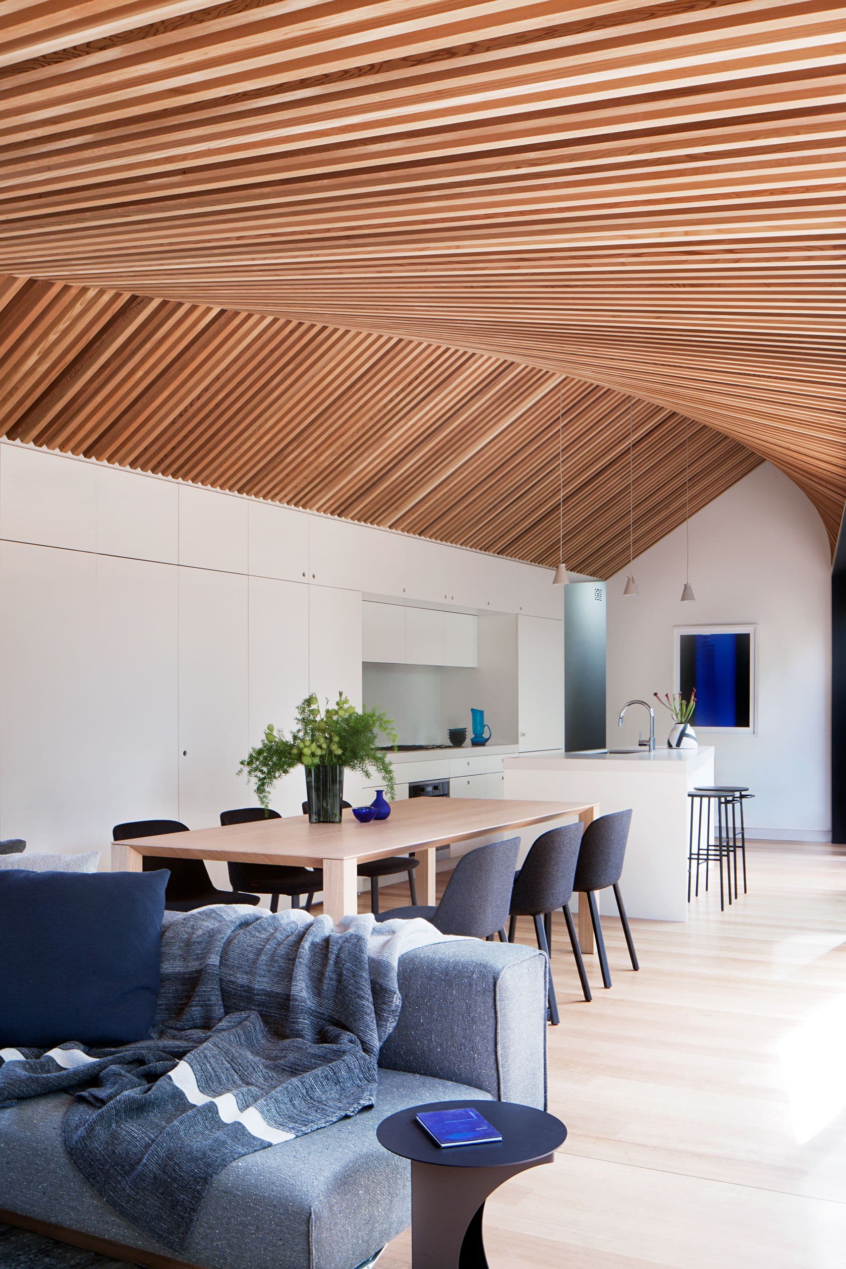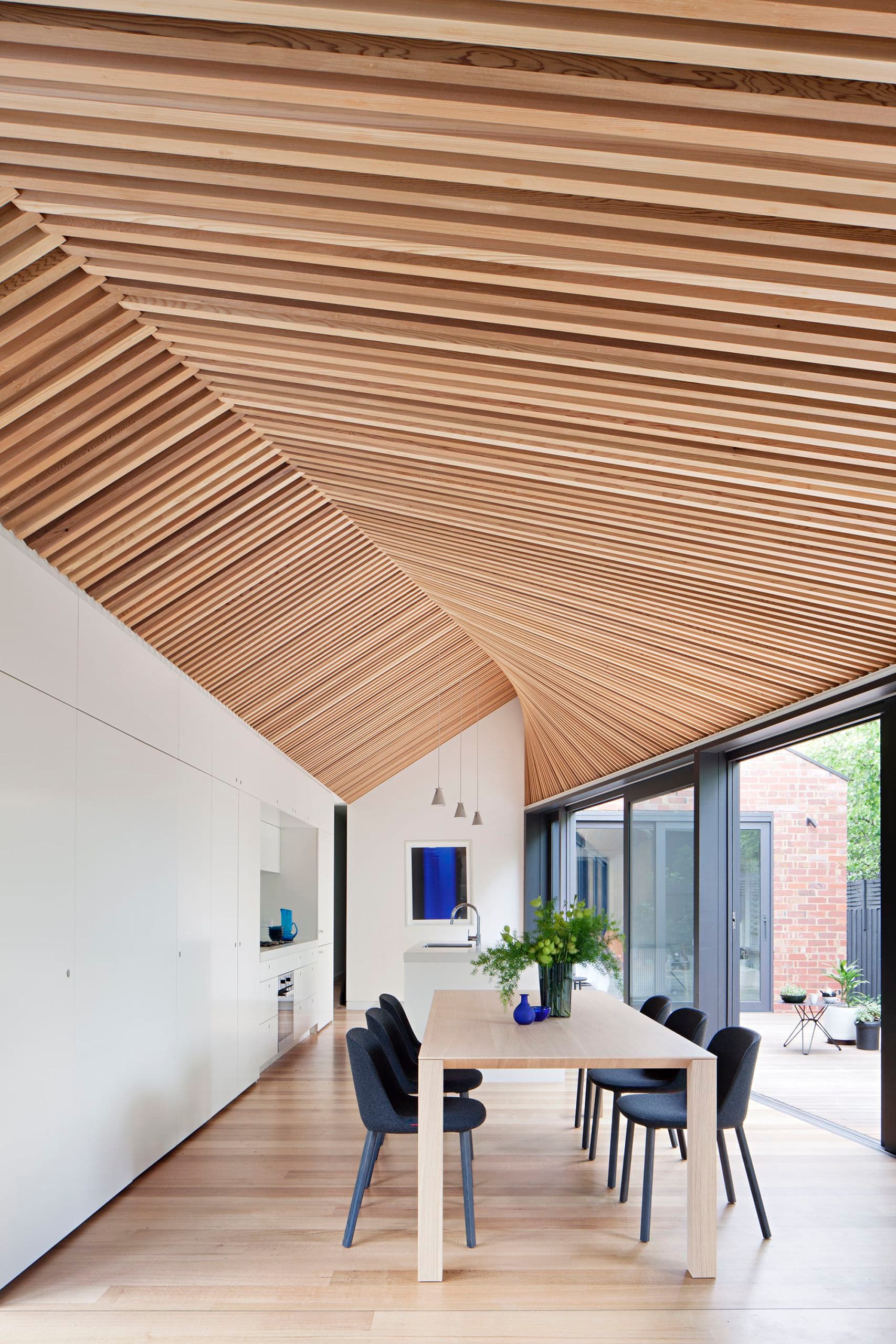 The materiality of the project is intentionally restrained and used primarily to articulate the formal diagram of the renovation and its optical affects. Walls and joinery are painted white and recessively detailed, clearly defining the trapezoidal base of the form; while the ceiling and eaves are lined in timber battens, emphasising the virtual curves of the geometry that emerge from a precise array of straight lines.