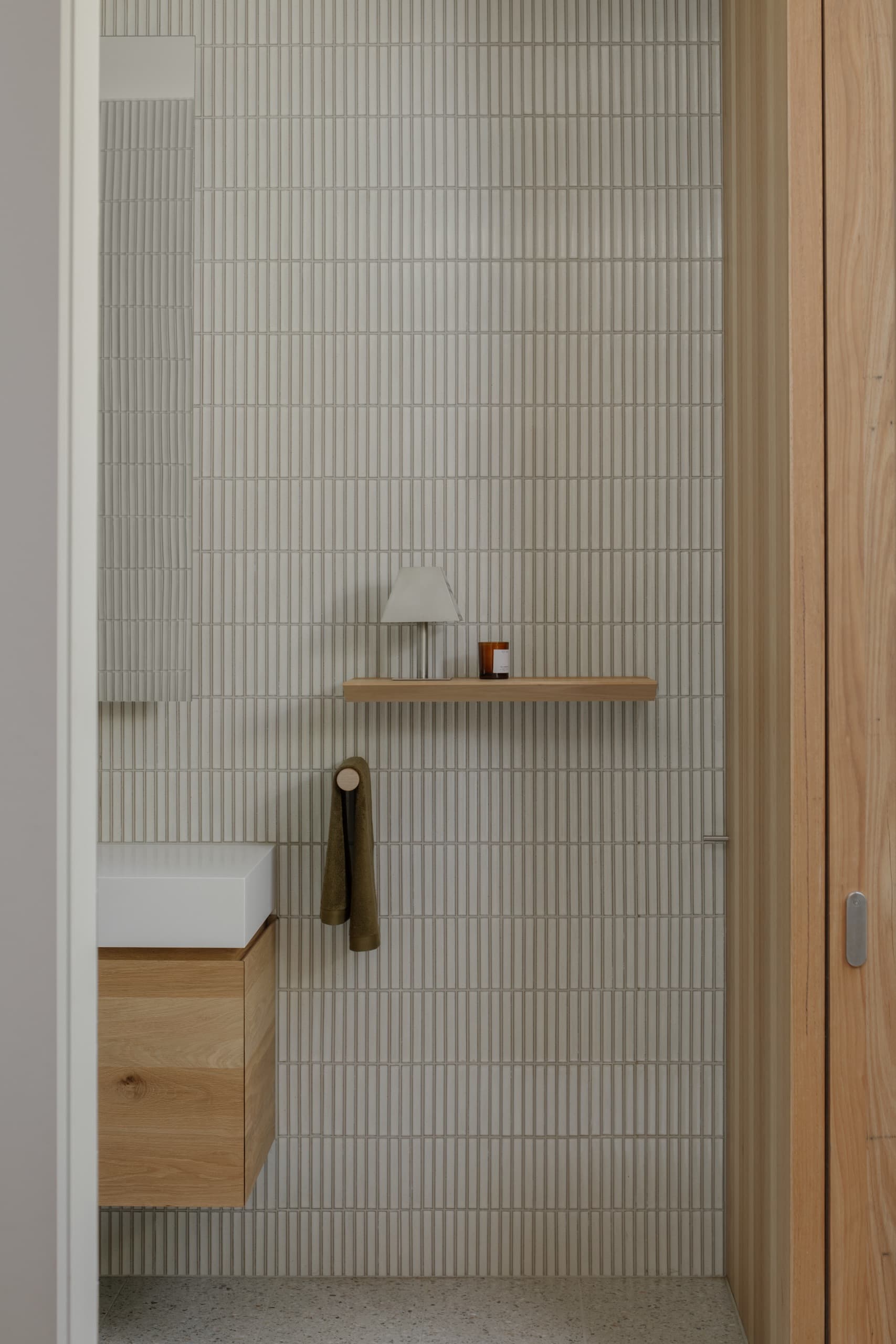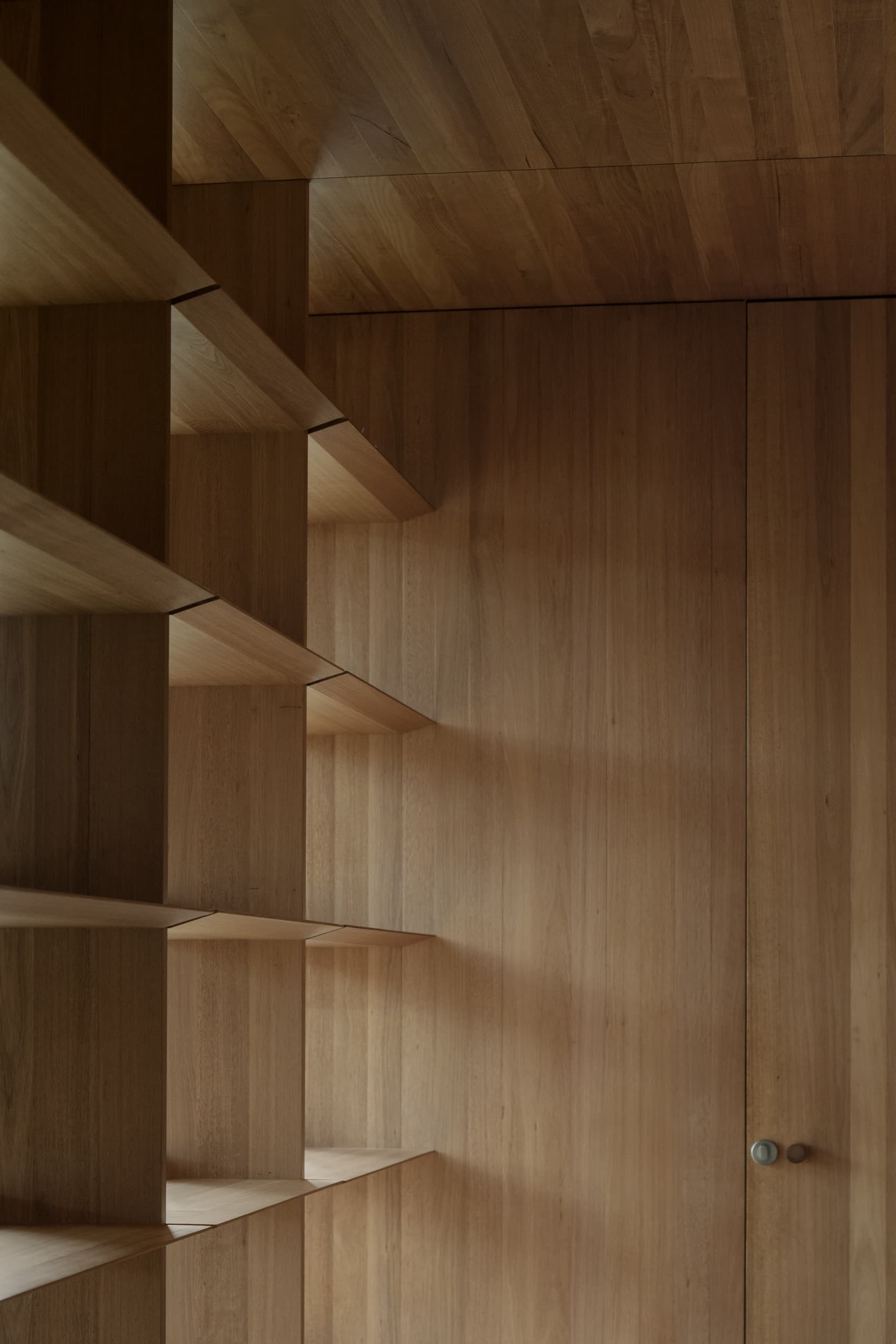 Materially, the house is unified by an almost singular palette of reclaimed timber, used for cladding, windows, doors, and joinery, imbuing the project with a tactile warmth and cohesion. Internally, the timber is milled in varied profiles to form integrated pulls, hooks, shelving, desks, benches, air-con grilles, and a picture rail system. A rigorous 75mm grid, derived from the width of a timber board, organizes every architectural element, from façade cladding to interior joinery, aligning components in plan and section to create visual clarity and precision. As this grid intersects the angled front facade, it governs all inflection points, alignments and junctions in three dimensions.