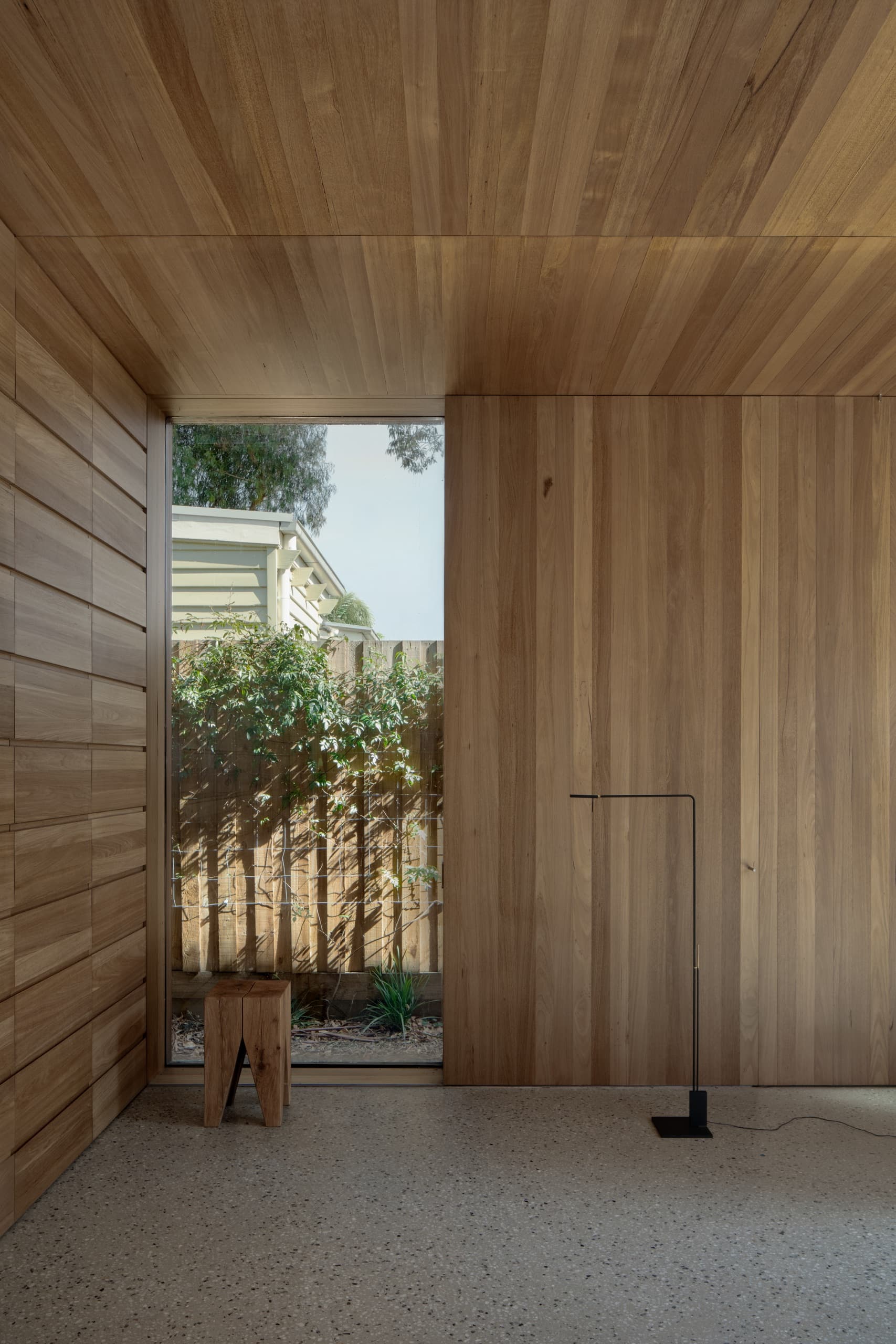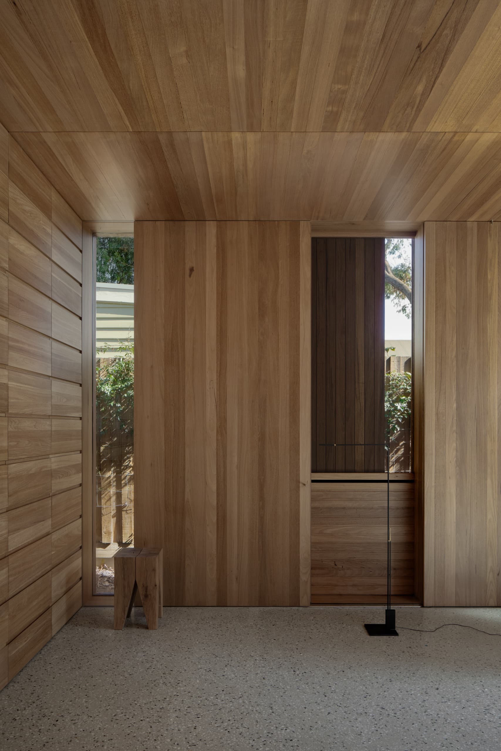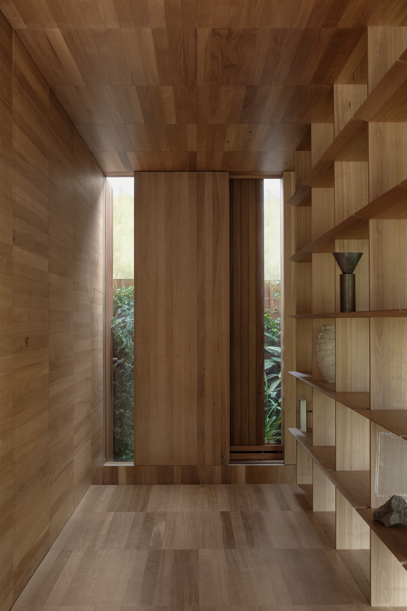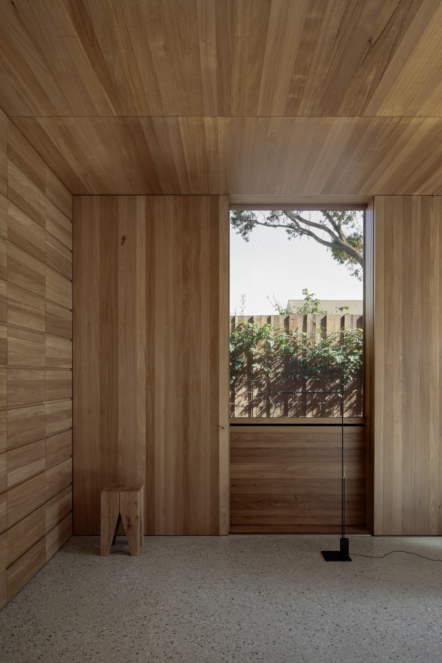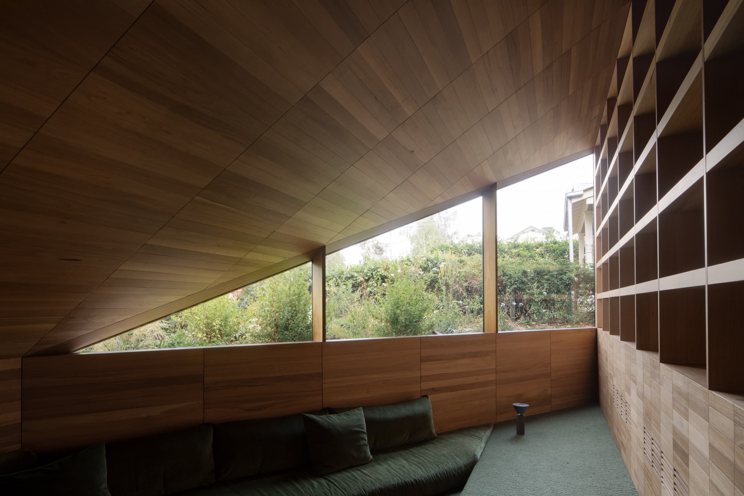 The house employs a modicum of window types. A large operable glazed wall opens to the rear garden; a fixed triangular window captures views to the street; and sliding timber-lined panels, seamlessly integrated into the east and west façades, provide nuanced control of light, ventilation, and privacy. These panels eliminate conventional window hardware, concealing operability and allowing the exterior to subtly transform throughout the day. In one position, they admit daylight and read as minimalist timber walls punctuated by fixed glass; in another, they ventilate the interior; in a third, they black out spaces for sleeping; and in a fourth, they shield interiors from sun and heat, significantly improving thermal performance.