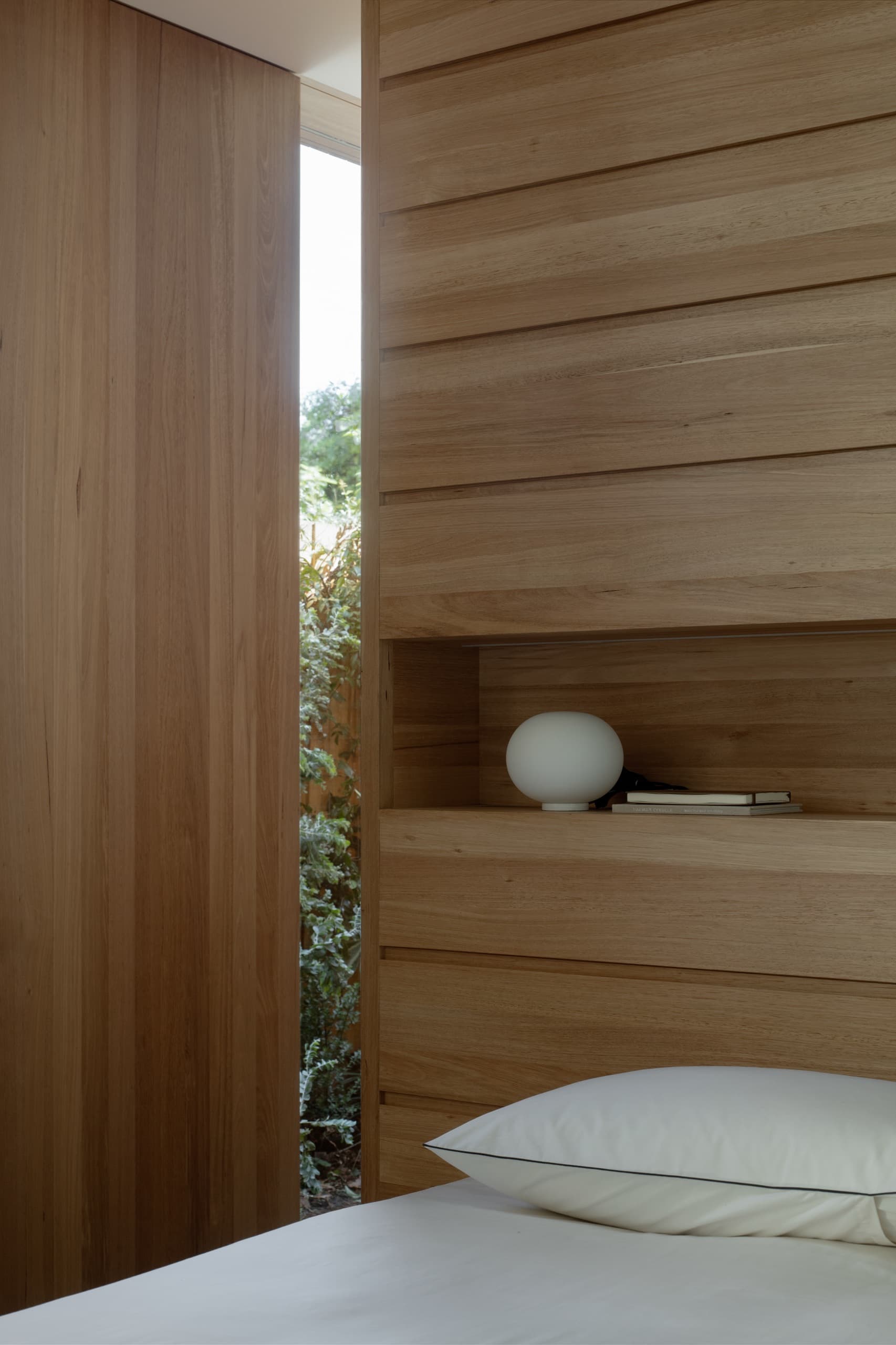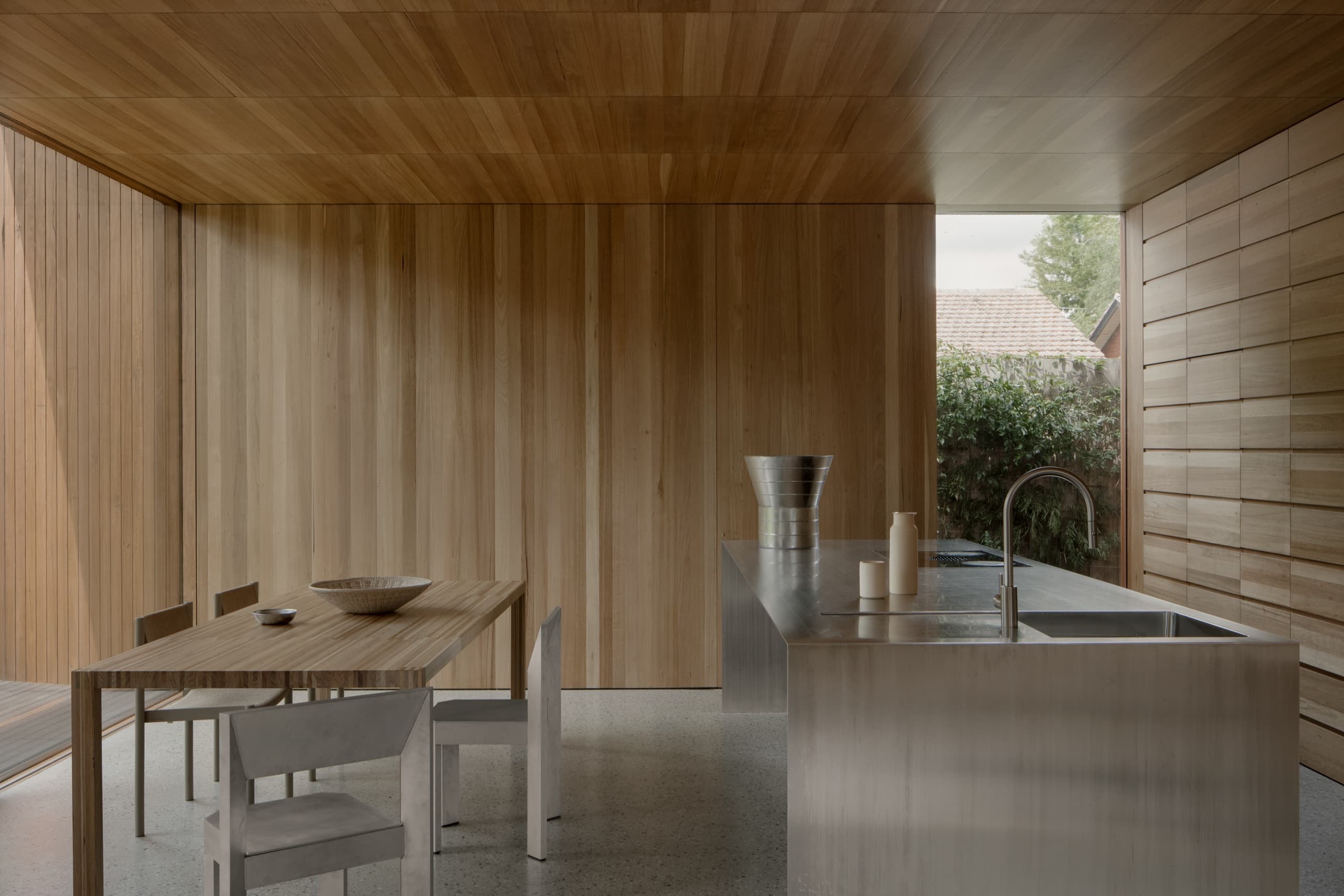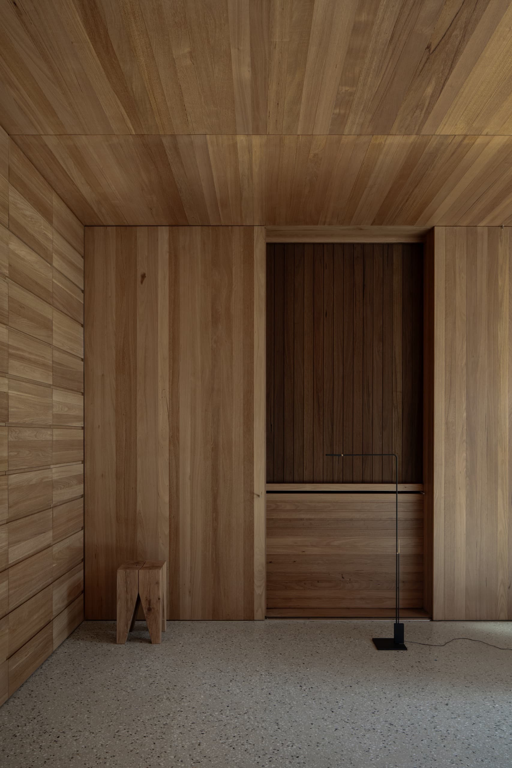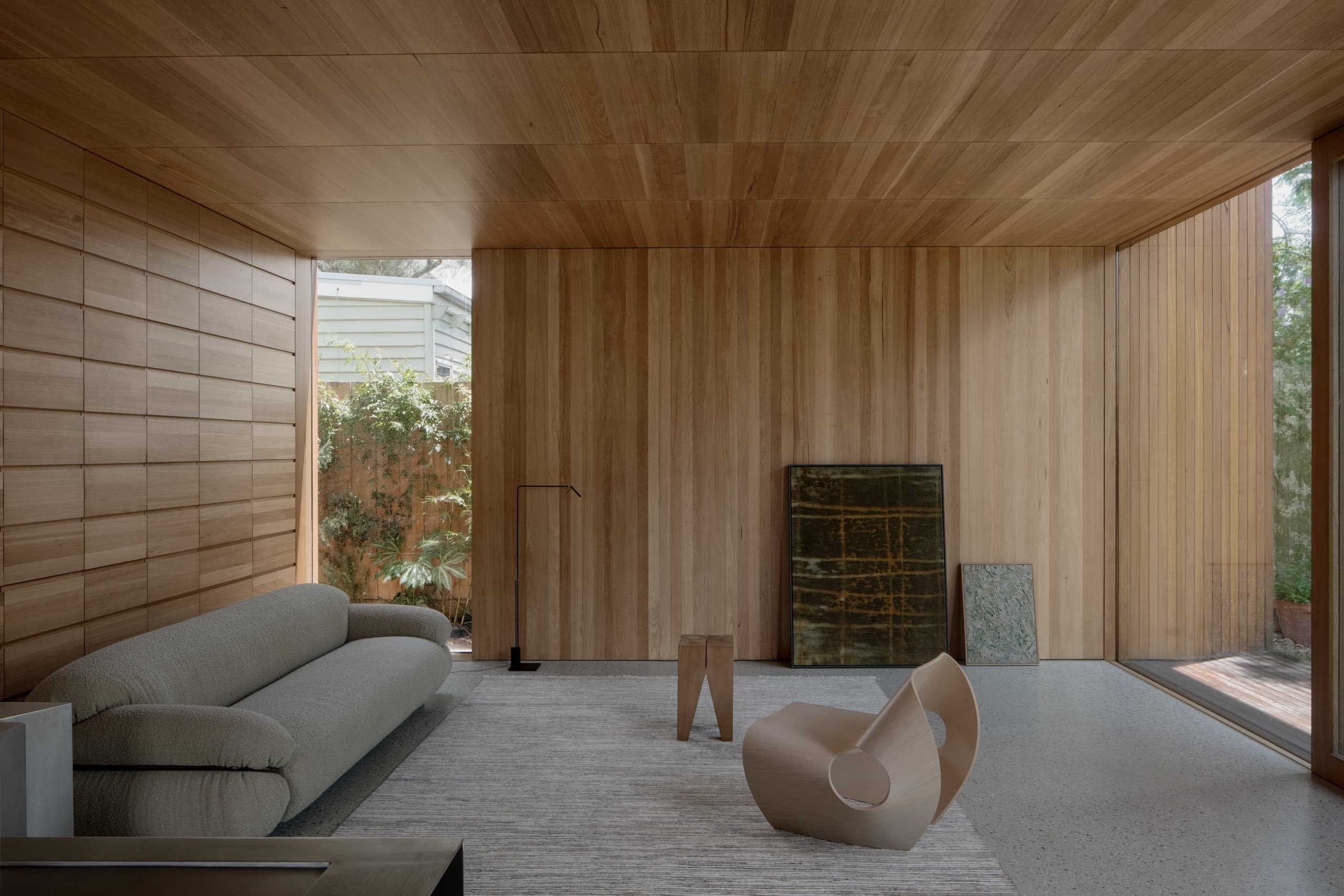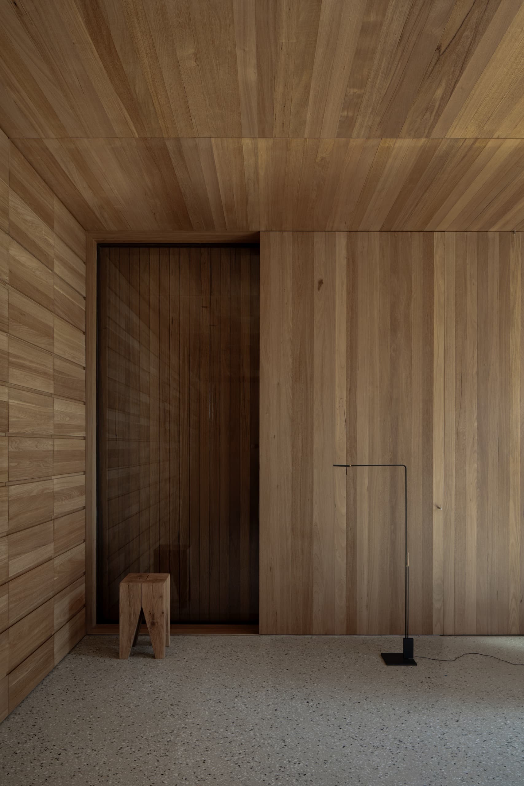 The house employs a modicum of window types. A large operable glazed wall opens to the rear garden; a fixed triangular window captures views to the street; and sliding timber-lined panels, seamlessly integrated into the east and west façades, provide nuanced control of light, ventilation, and privacy. These panels eliminate conventional window hardware, concealing operability and allowing the exterior to subtly transform throughout the day. In one position, they admit daylight and read as minimalist timber walls punctuated by fixed glass; in another, they ventilate the interior; in a third, they black out spaces for sleeping; and in a fourth, they shield interiors from sun and heat, significantly improving thermal performance.