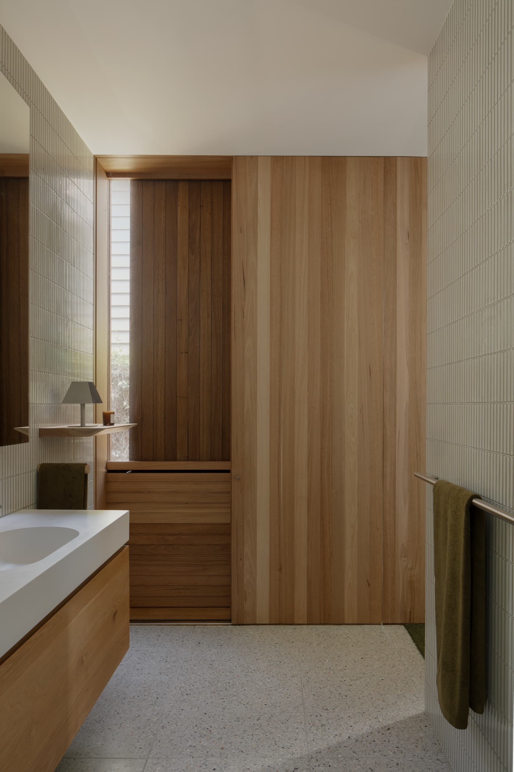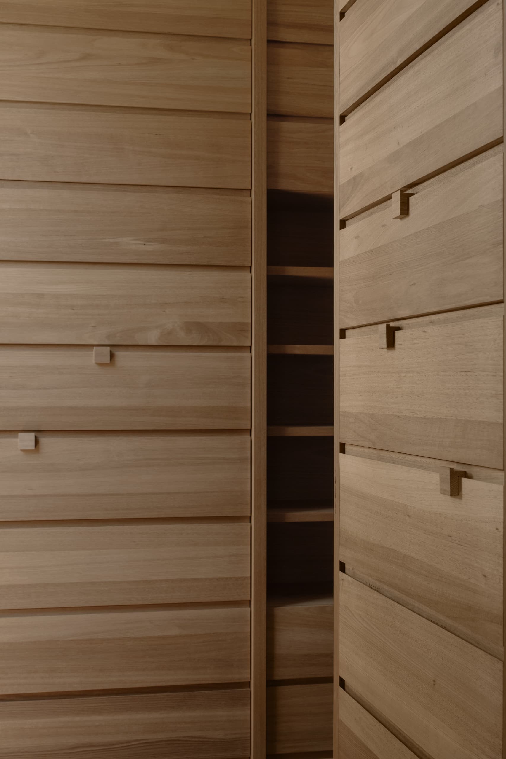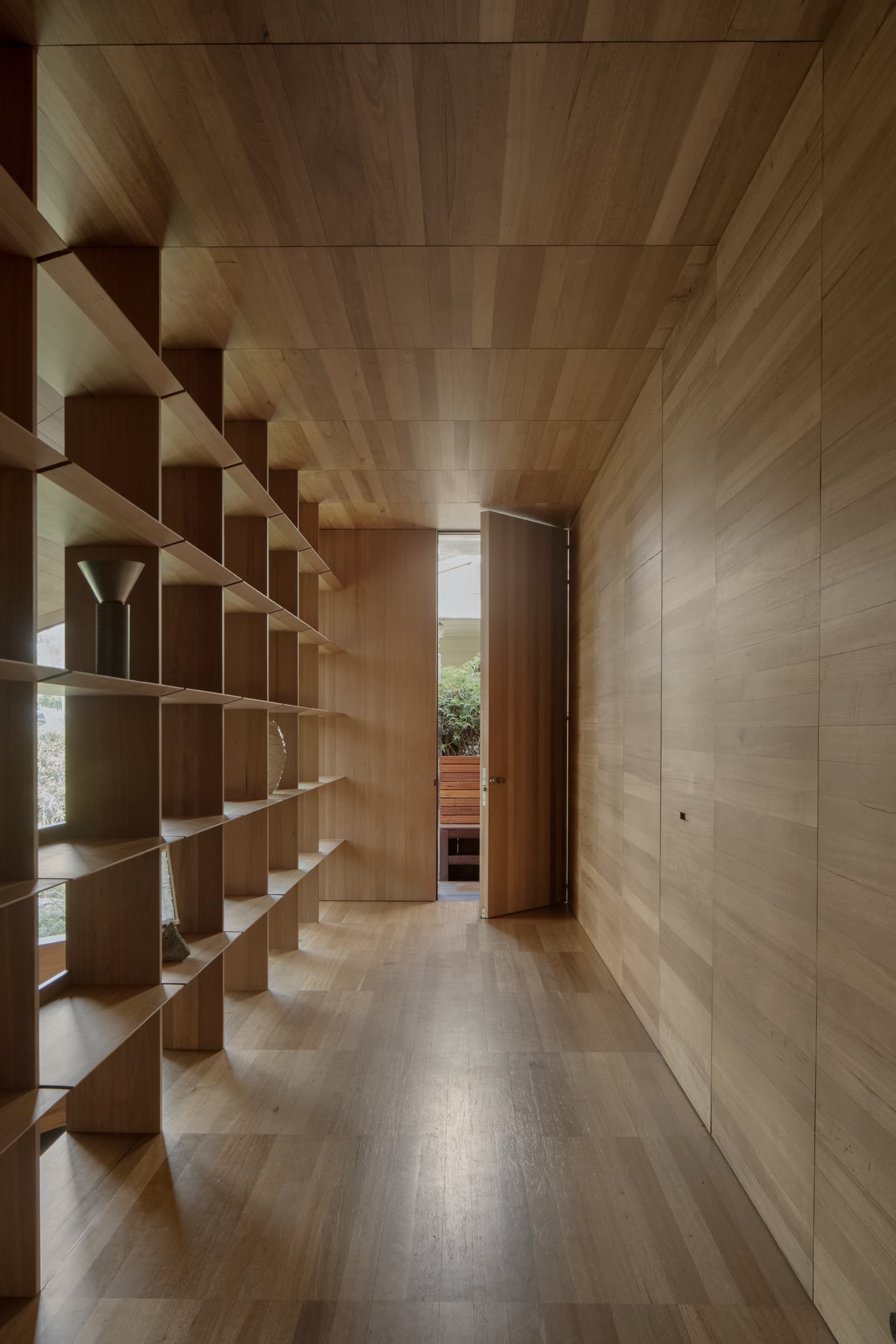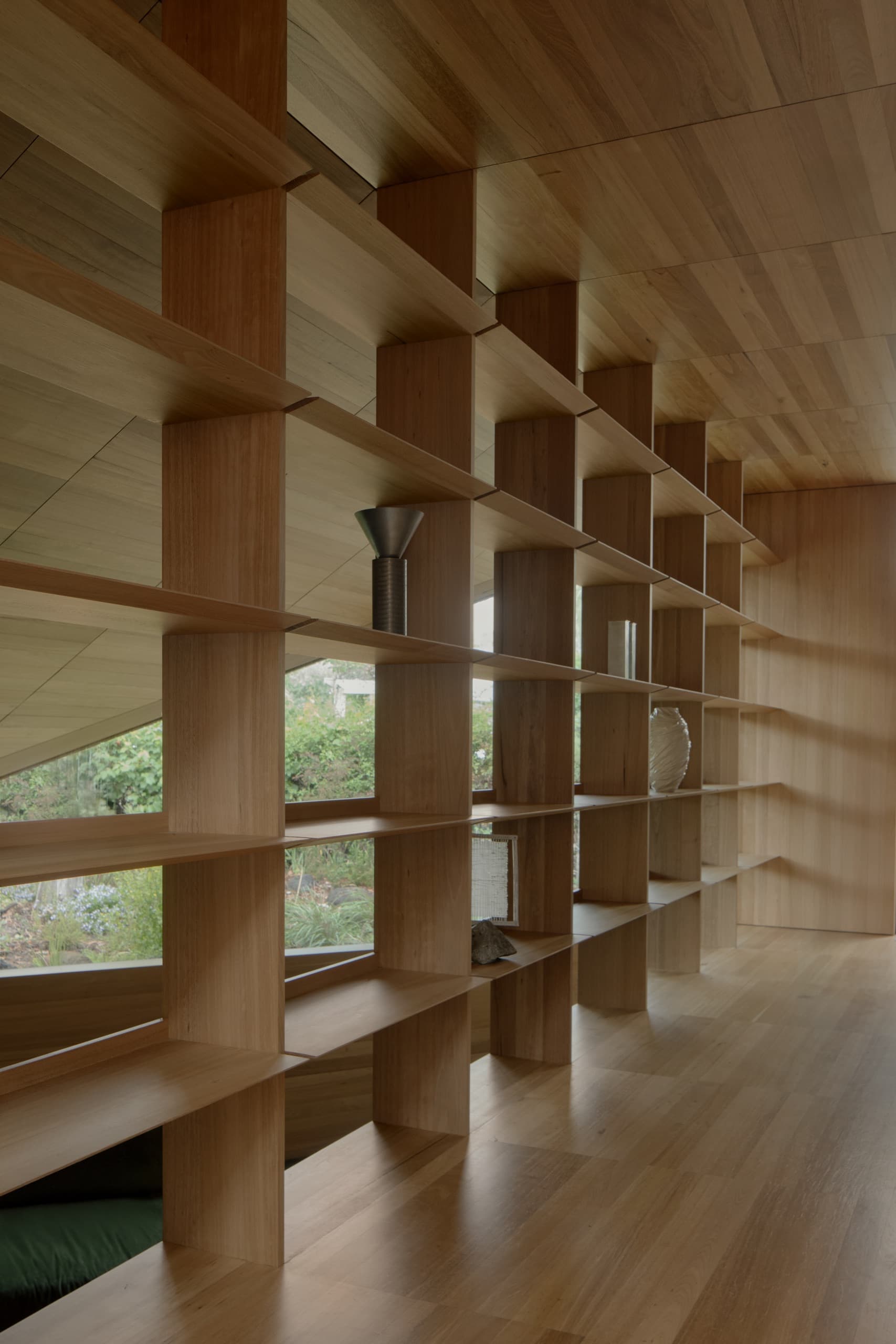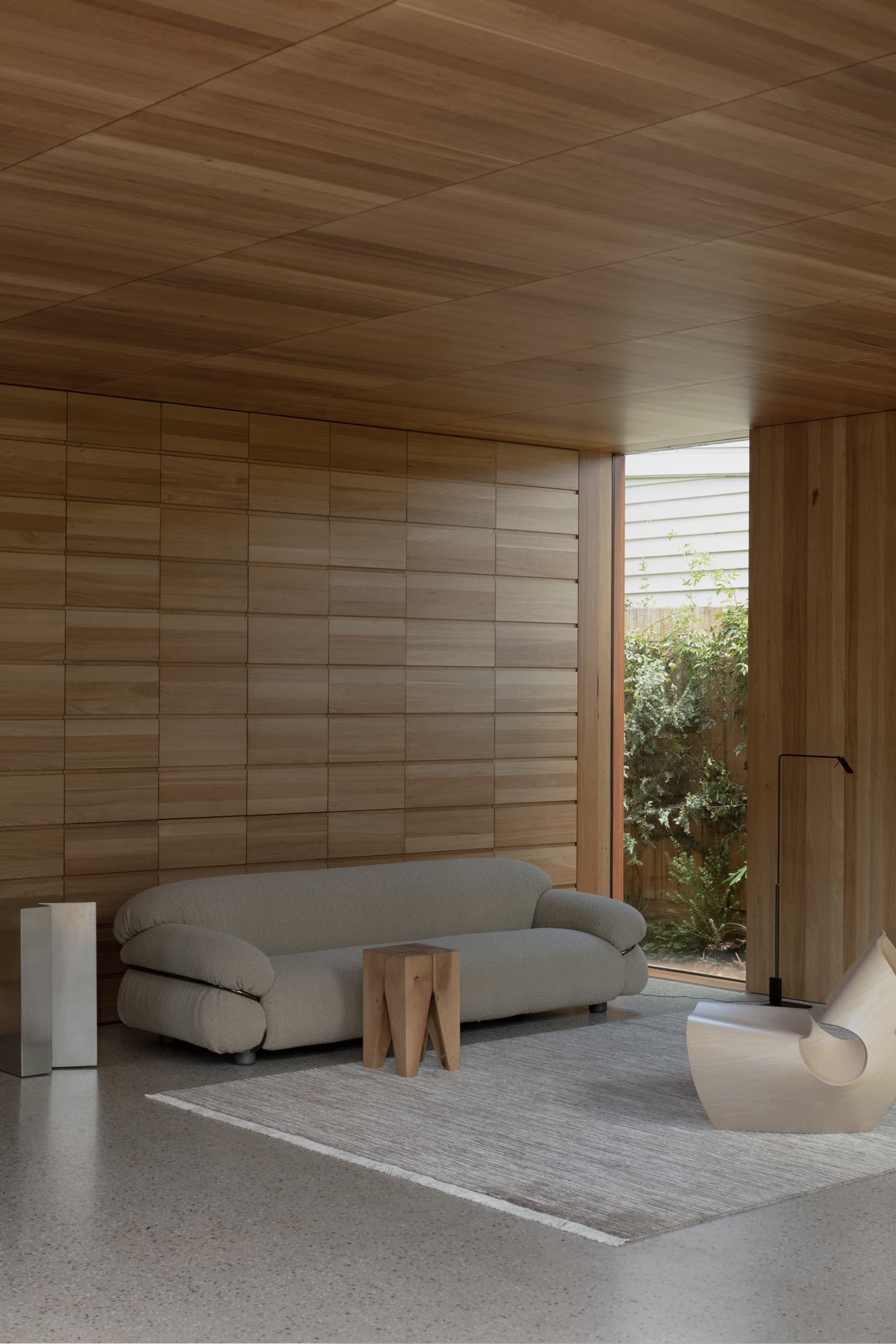 The house employs a modicum of window types. A large operable glazed wall opens to the rear garden; a fixed triangular window captures views to the street; and sliding timber-lined panels, seamlessly integrated into the east and west façades, provide nuanced control of light, ventilation, and privacy. These panels eliminate conventional window hardware, concealing operability and allowing the exterior to subtly transform throughout the day. In one position, they admit daylight and read as minimalist timber walls punctuated by fixed glass; in another, they ventilate the interior; in a third, they black out spaces for sleeping; and in a fourth, they shield interiors from sun and heat, significantly improving thermal performance.