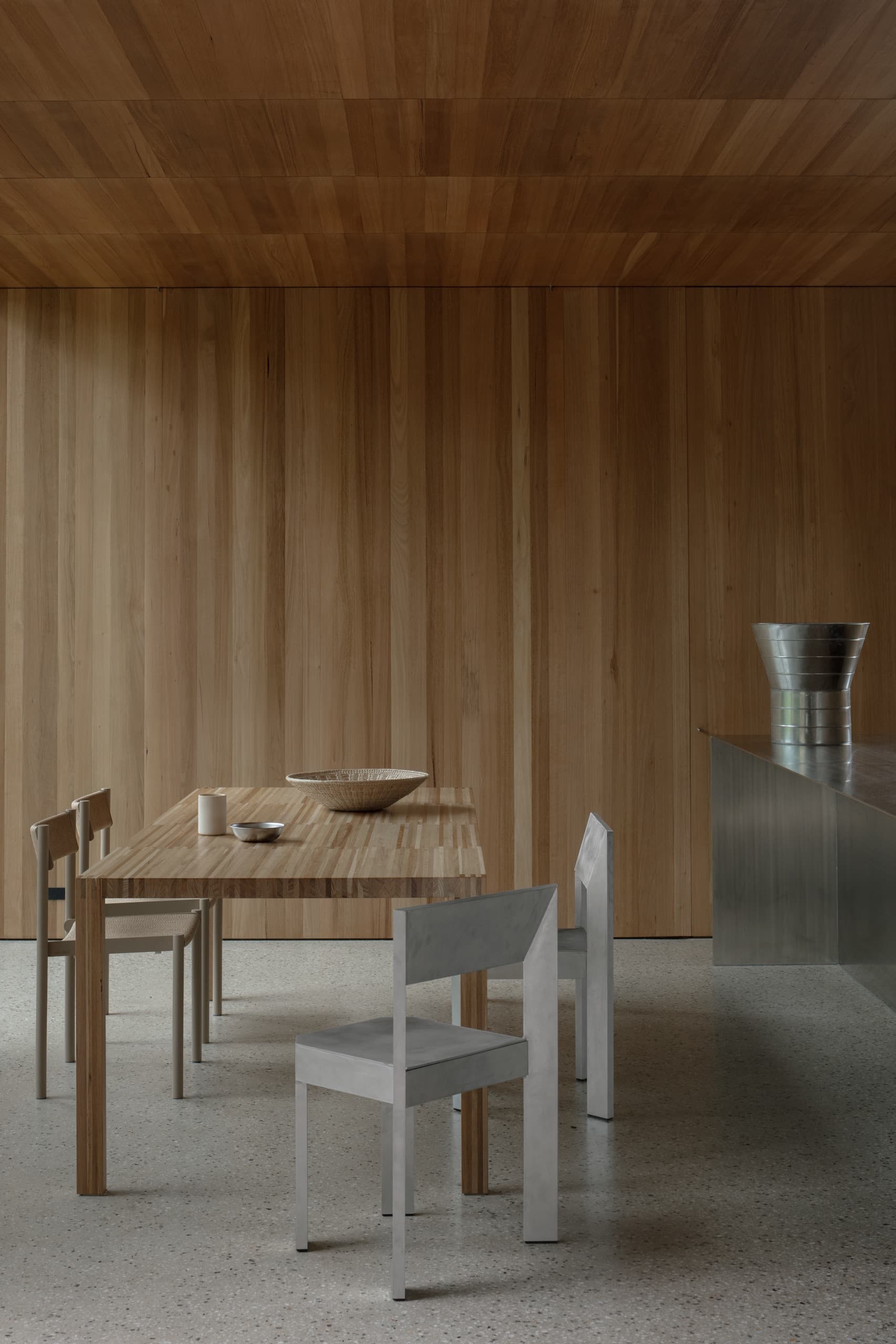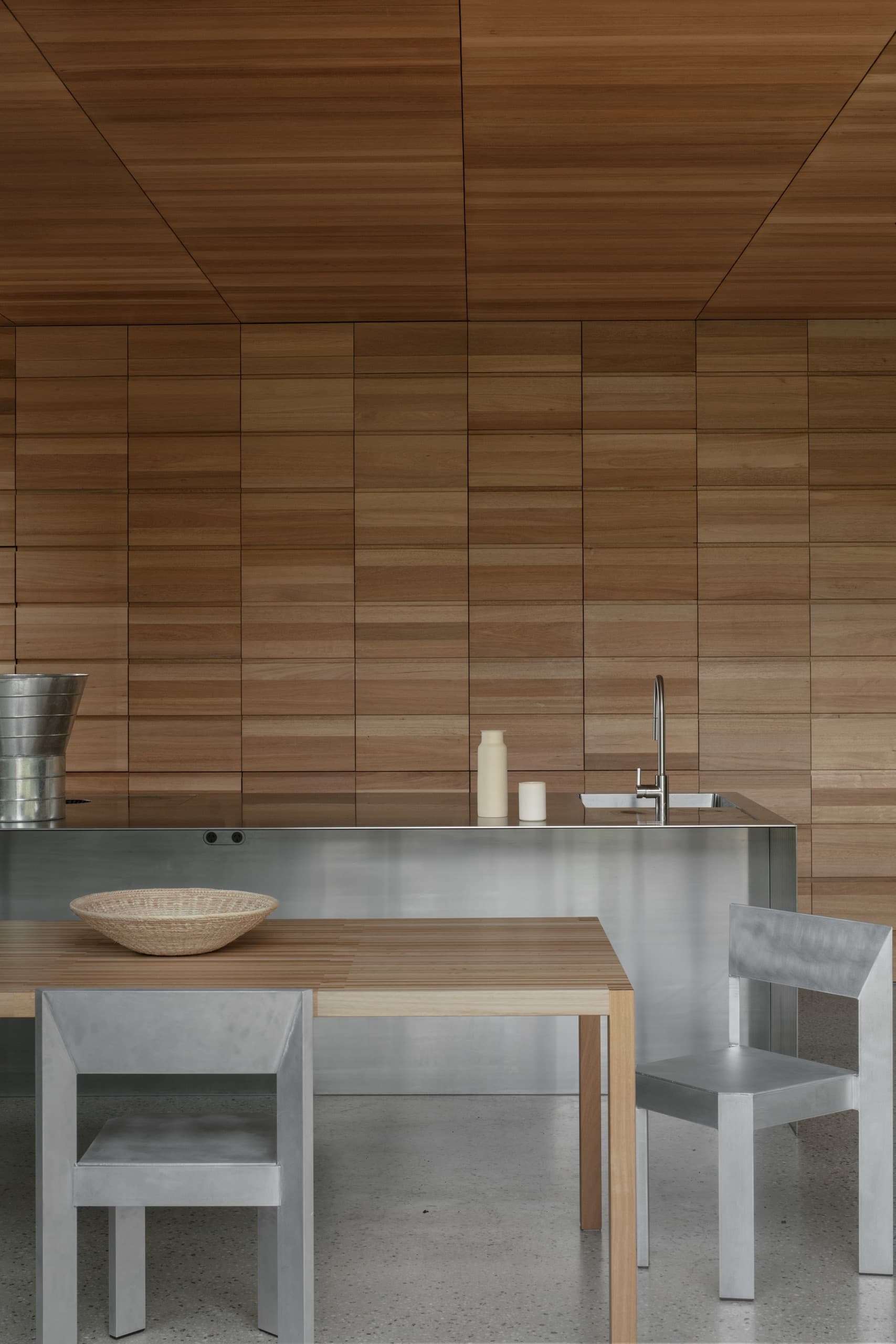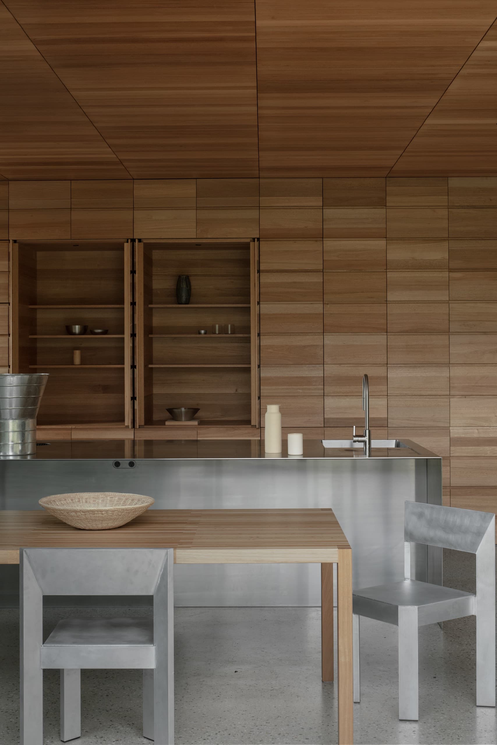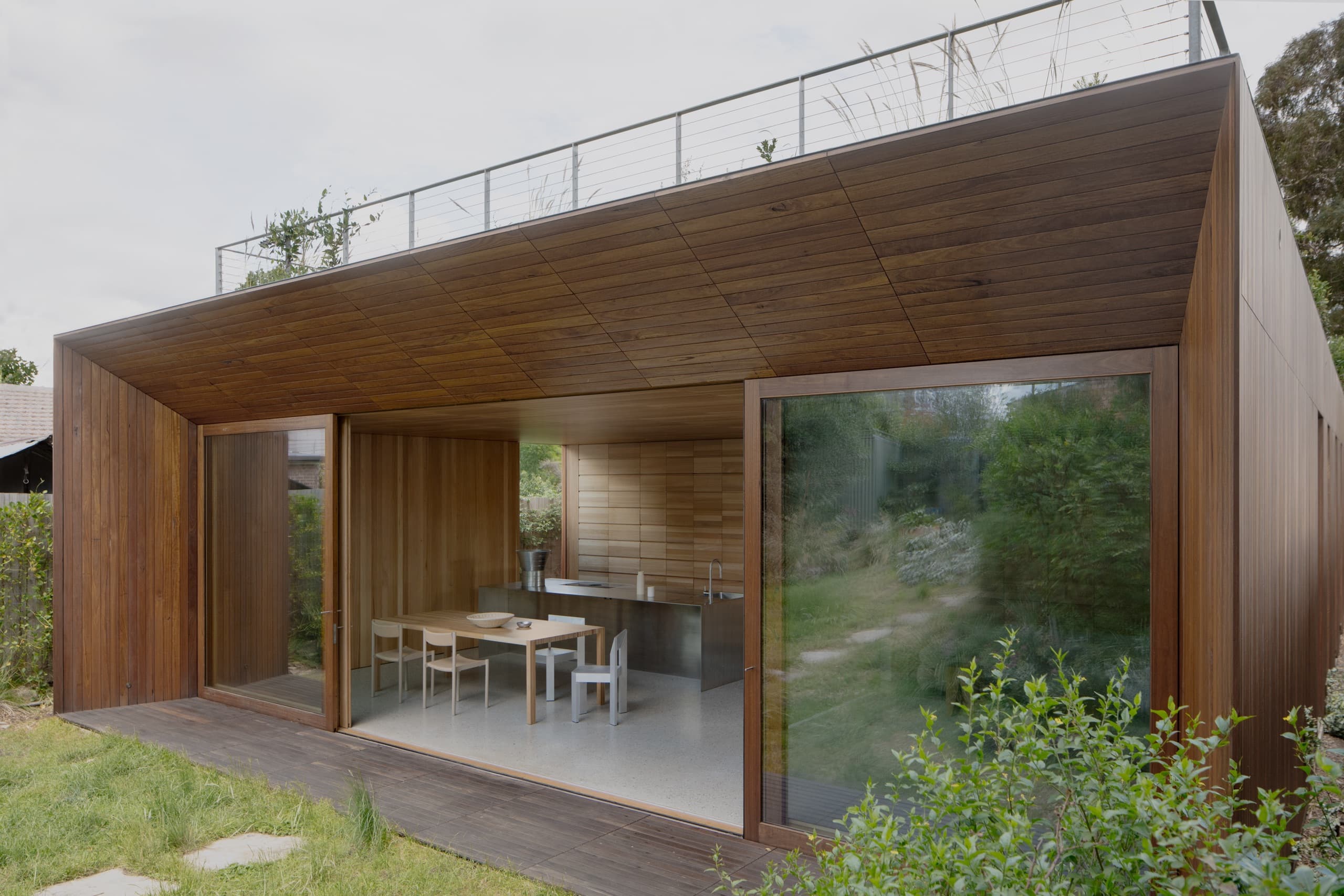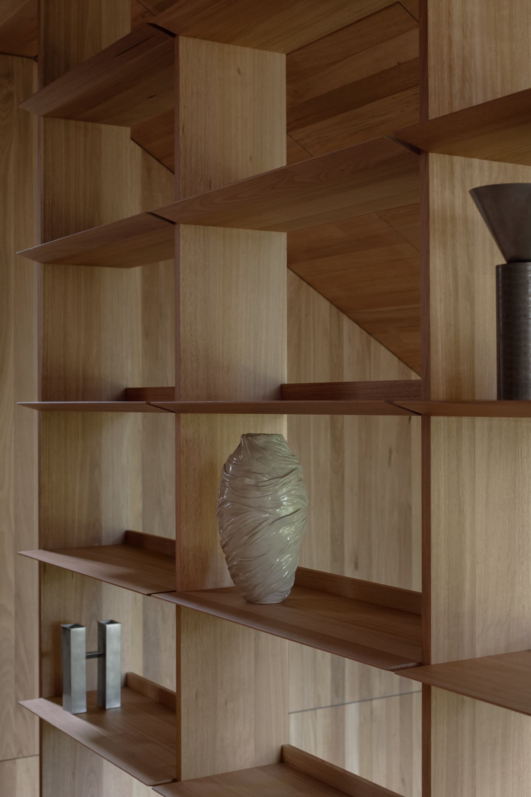 The house employs a modicum of window types. A large operable glazed wall opens to the rear garden; a fixed triangular window captures views to the street; and sliding timber-lined panels, seamlessly integrated into the east and west façades, provide nuanced control of light, ventilation, and privacy. These panels eliminate conventional window hardware, concealing operability and allowing the exterior to subtly transform throughout the day. In one position, they admit daylight and read as minimalist timber walls punctuated by fixed glass; in another, they ventilate the interior; in a third, they black out spaces for sleeping; and in a fourth, they shield interiors from sun and heat, significantly improving thermal performance.