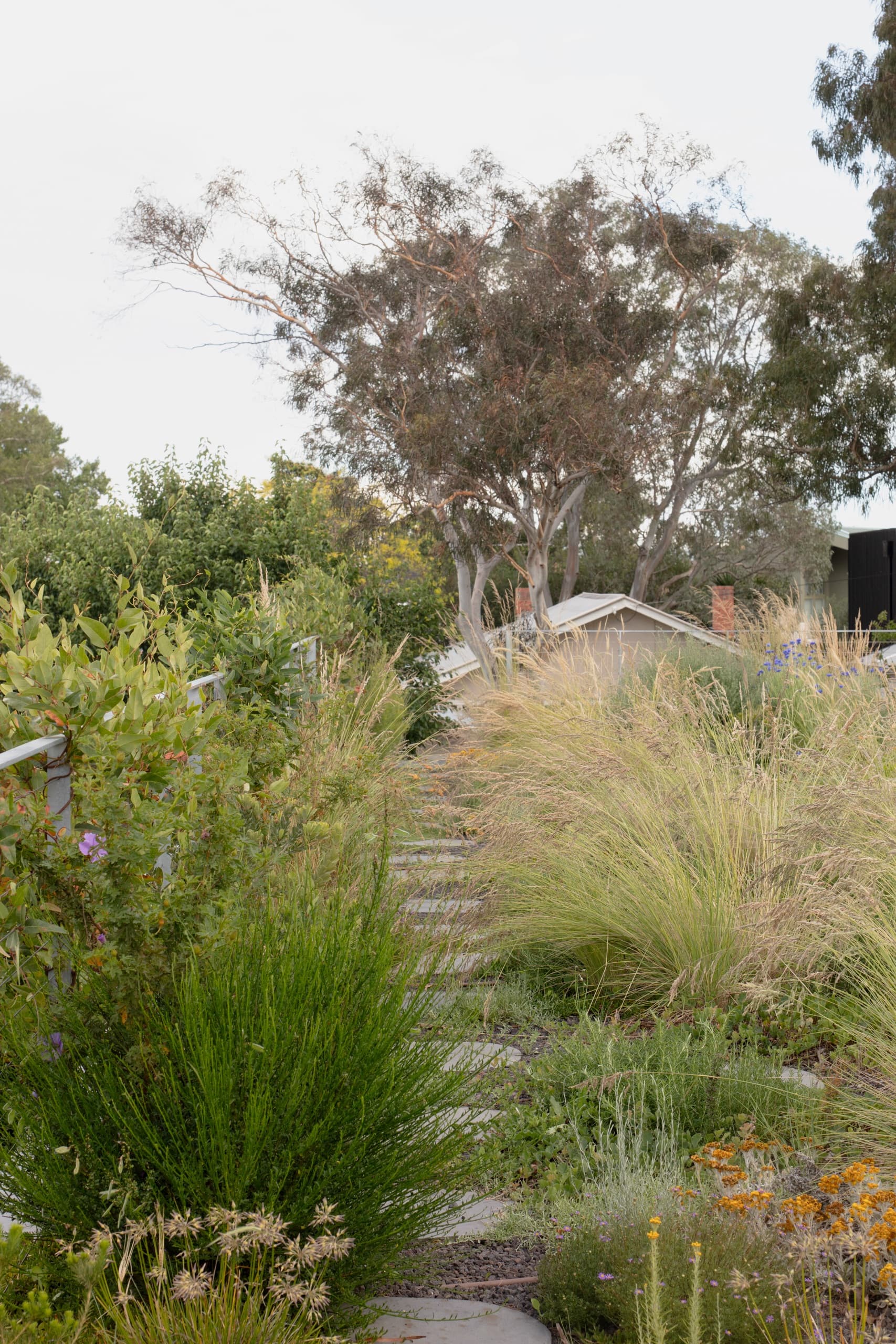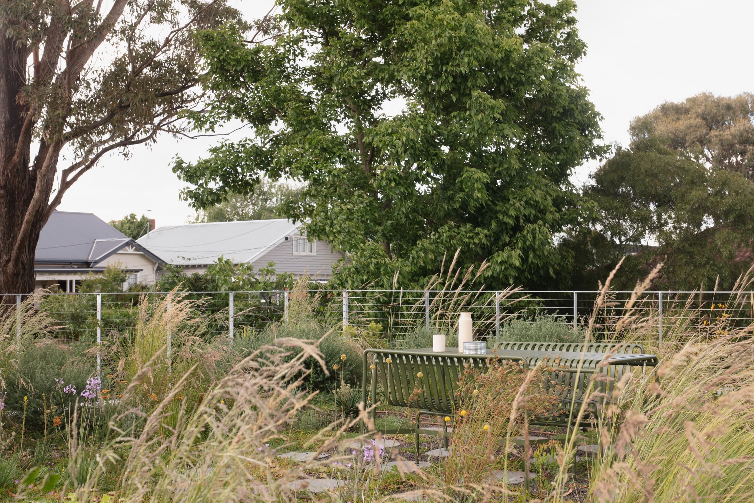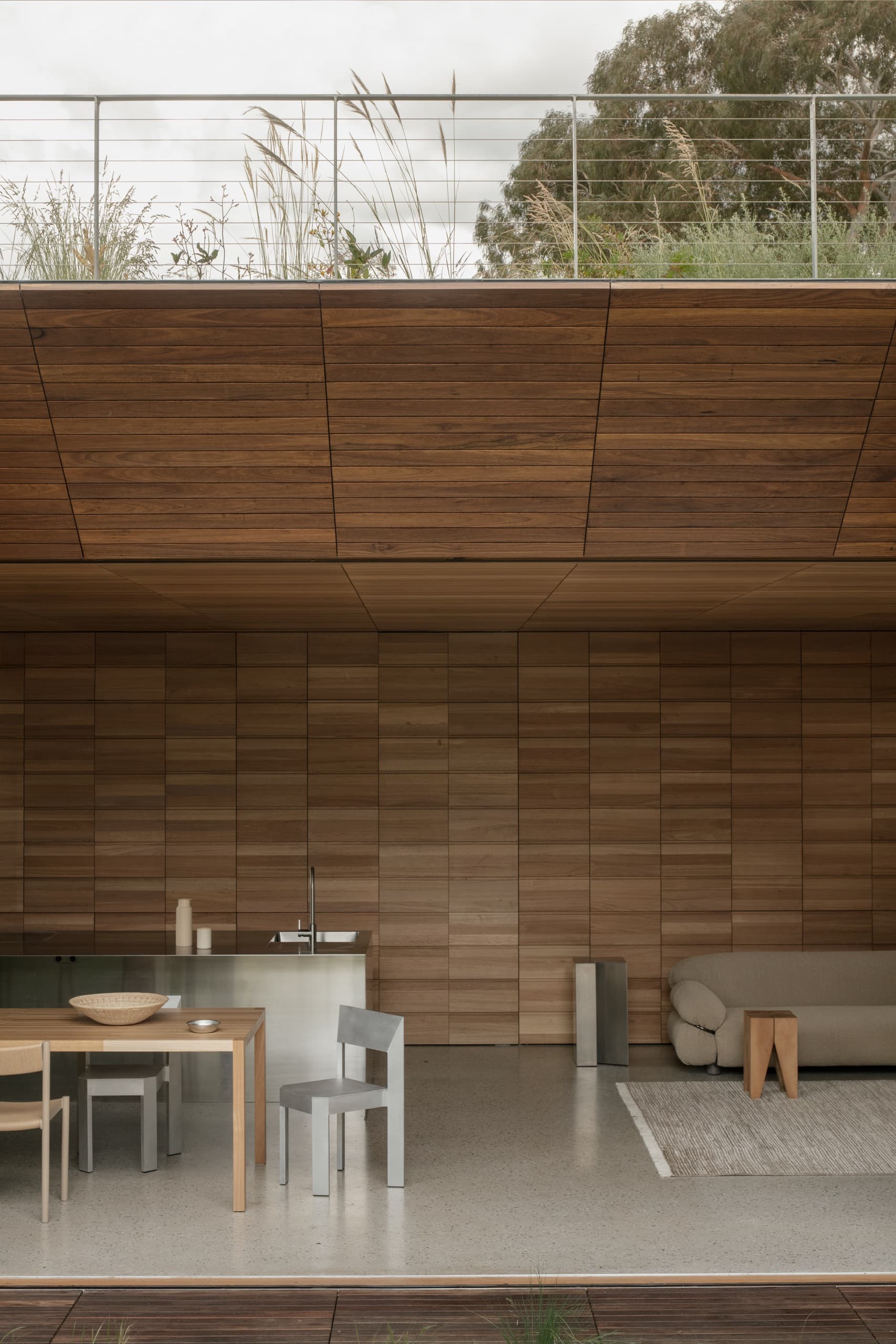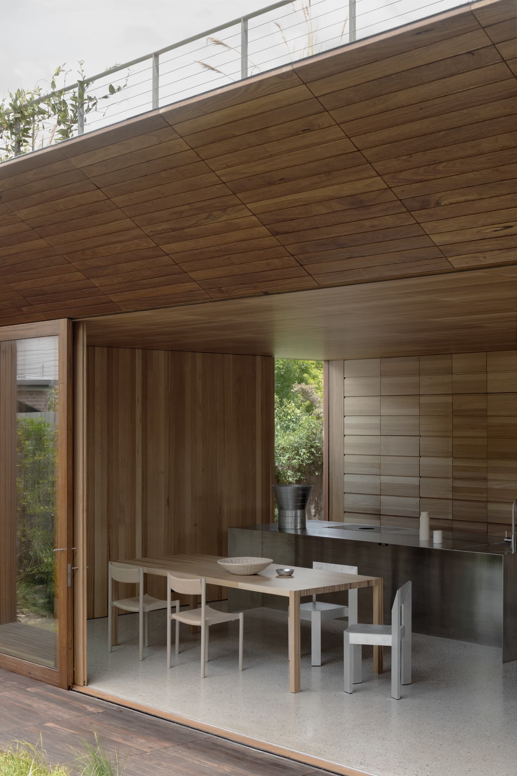 The design deliberately resists several suburban conventions typically included in an architectural brief: there is no ensuite for every bedroom, no walk-in pantry, no garage, and no front fence. Instead, the architecture privileges openness, restraint, and community connection over domestic excess.