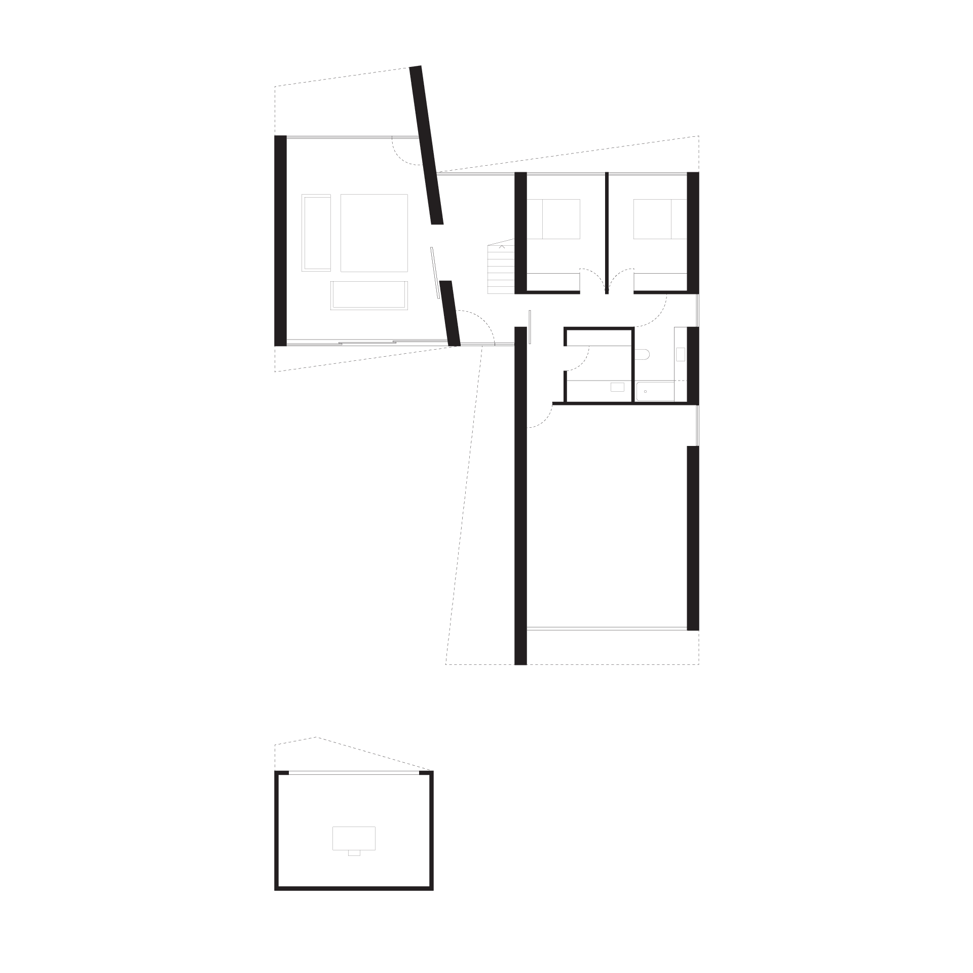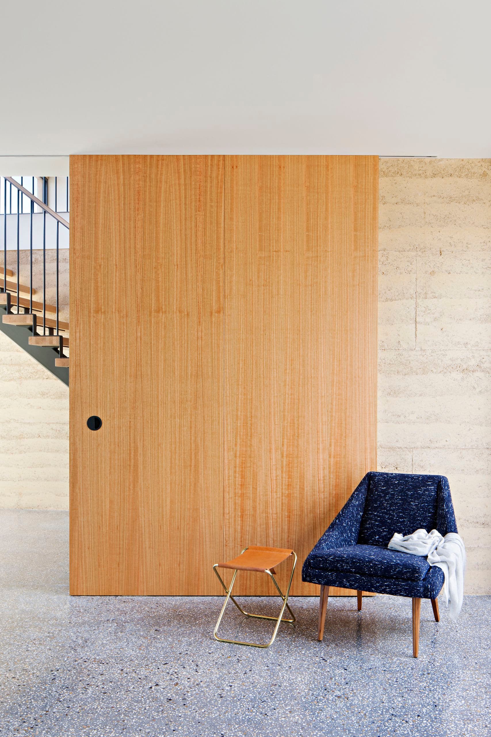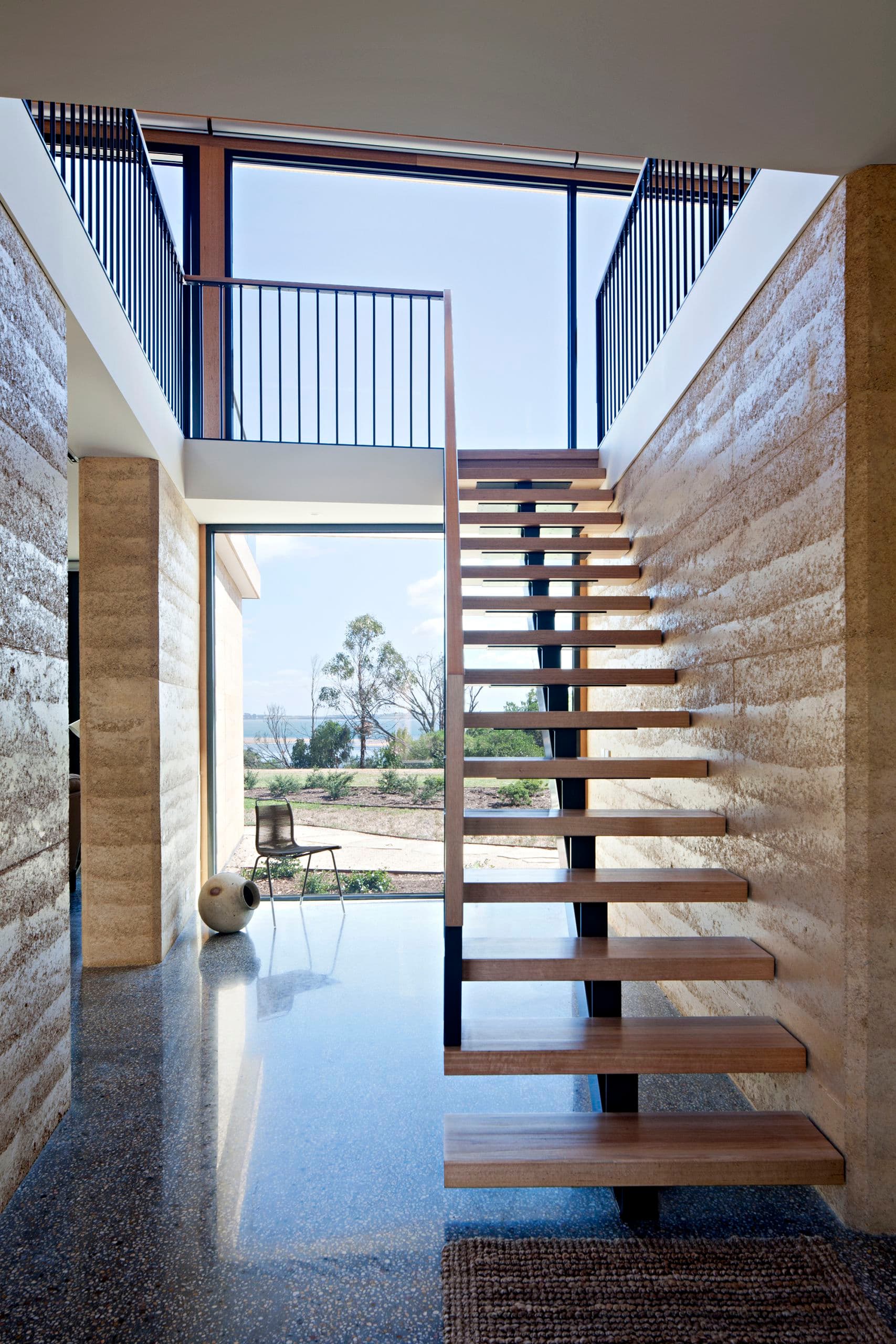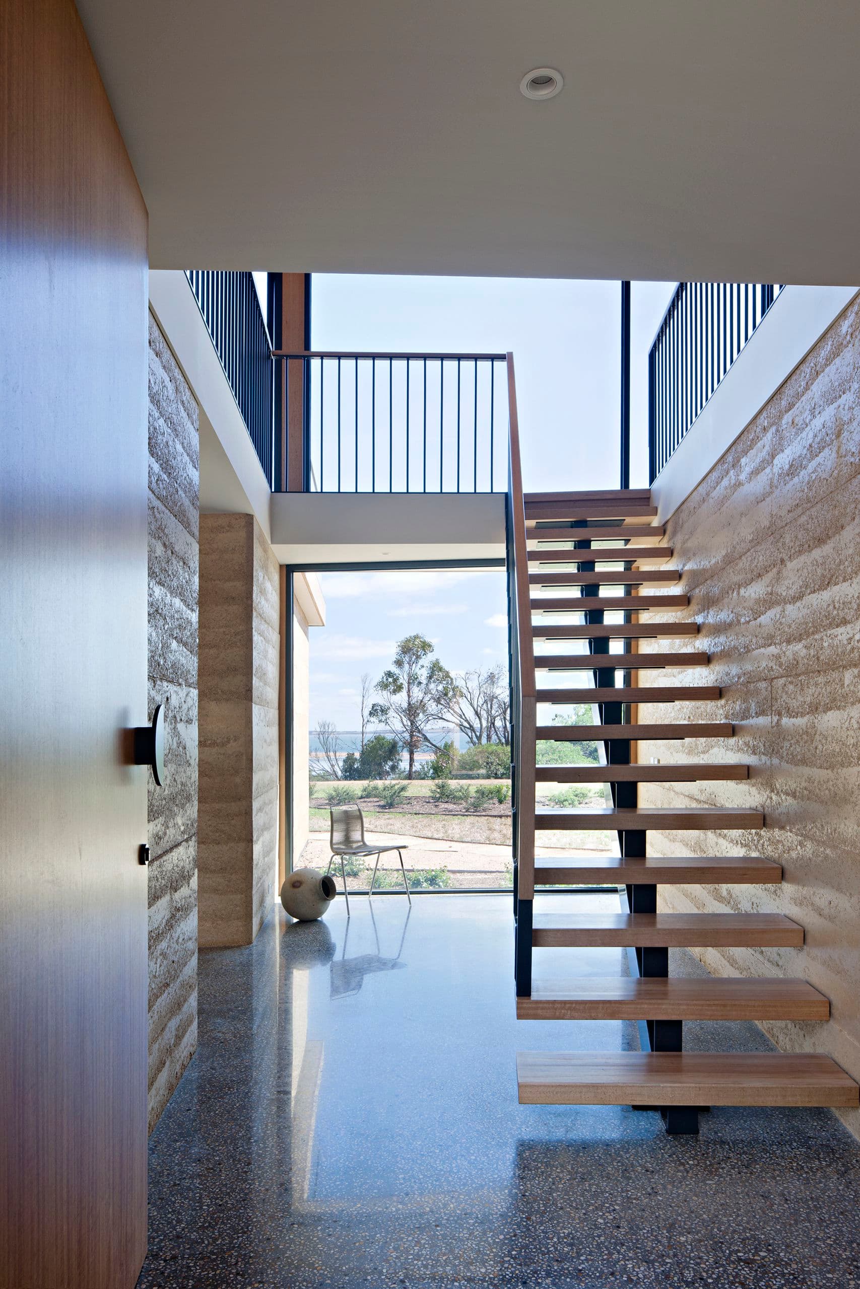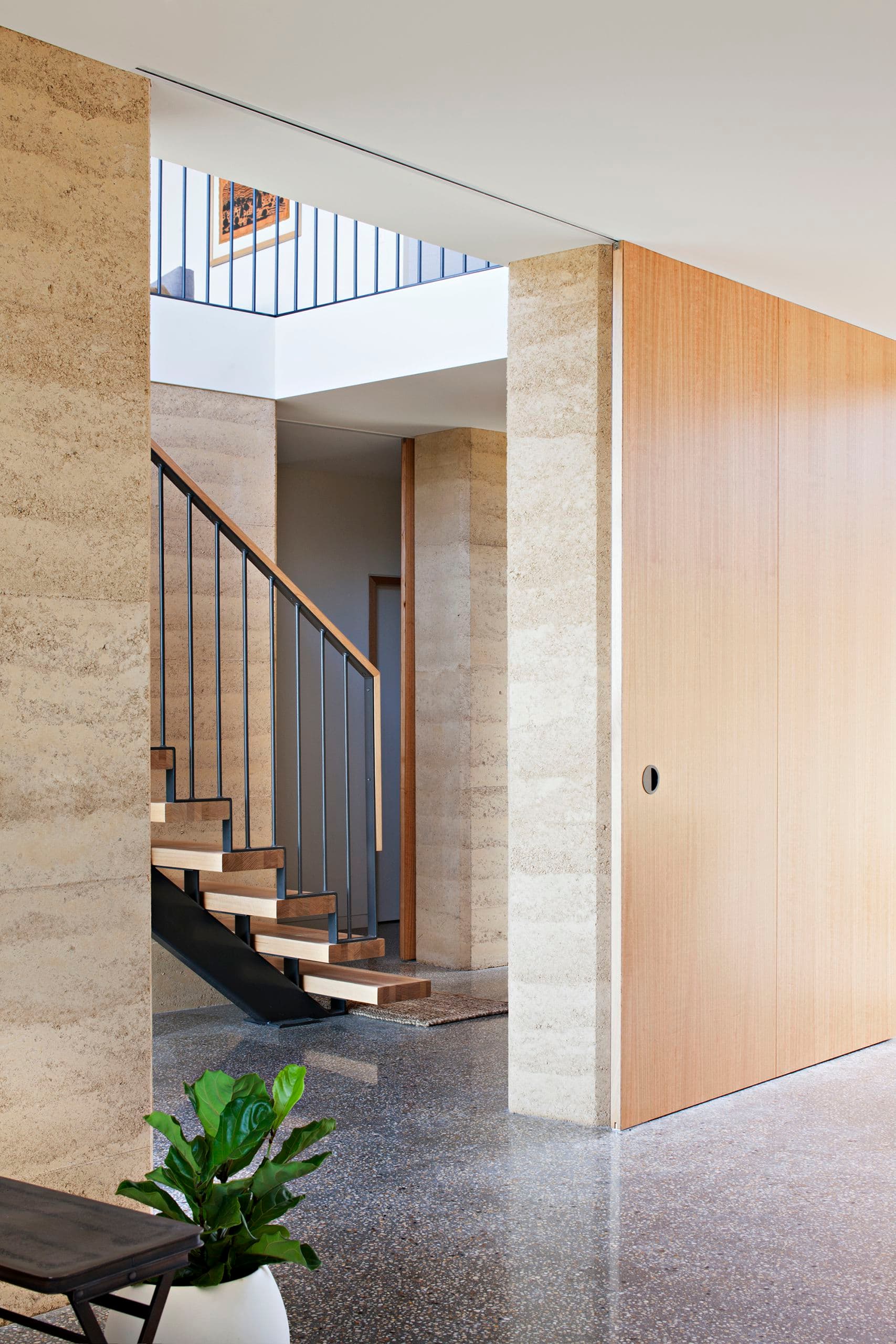 The central stair void, which provides a dramatic point of entry to the house proper, is a singular moment at which the clarity of the ground floor is overlaid with the complexity of the upper volume, an alternate oblique spatial grid juxtaposed with the suburban orientation of the site. Fine steel and timber detail intersect with the course grain of the rammed earth to further articulate the spatial tension.