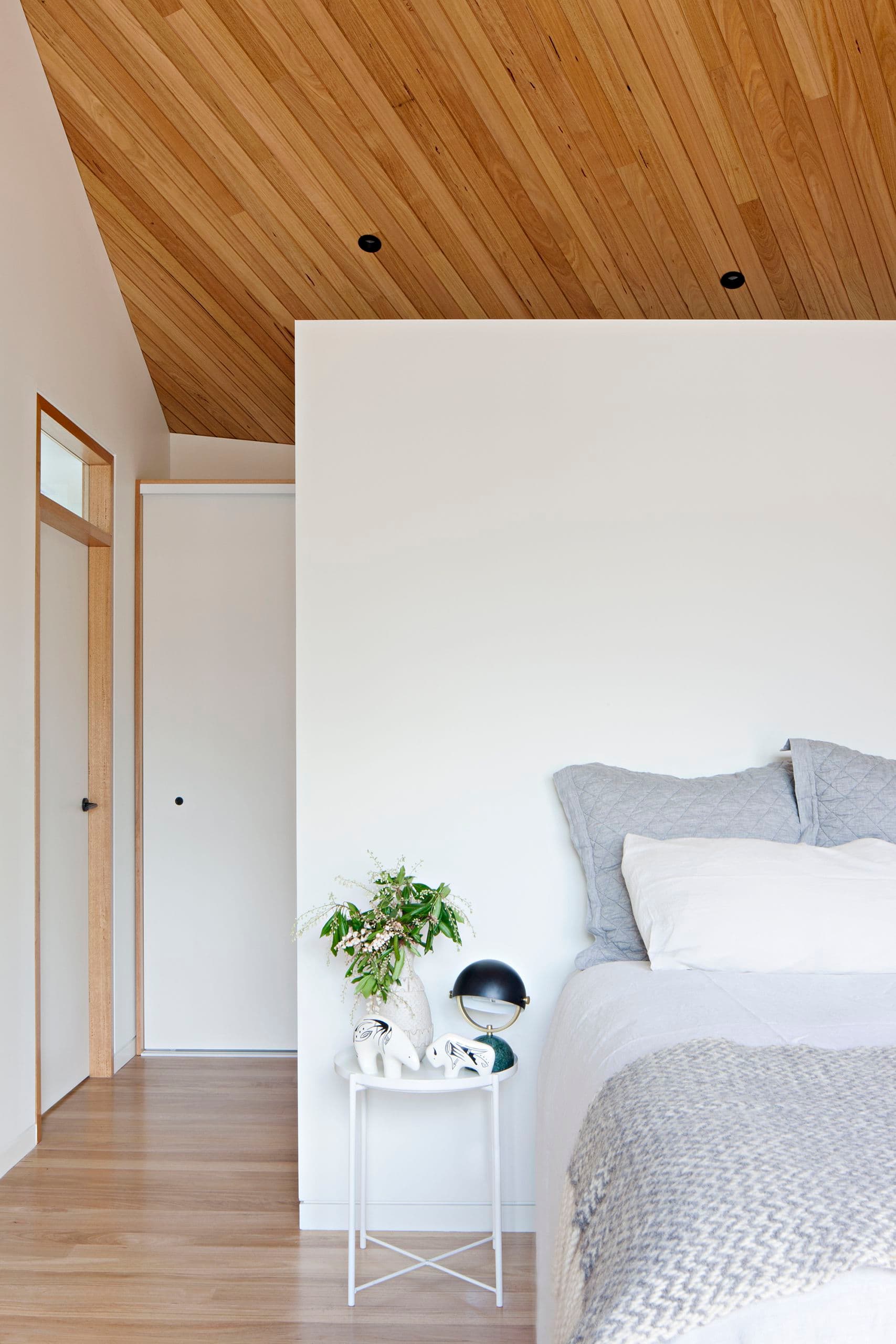 Experientially the upper level is a clear contrast to below, flooded with north light the space flows beneath a dramatic timber ceiling as it registers the contortions of the roof shifting between gable and skillion in pure elevation.