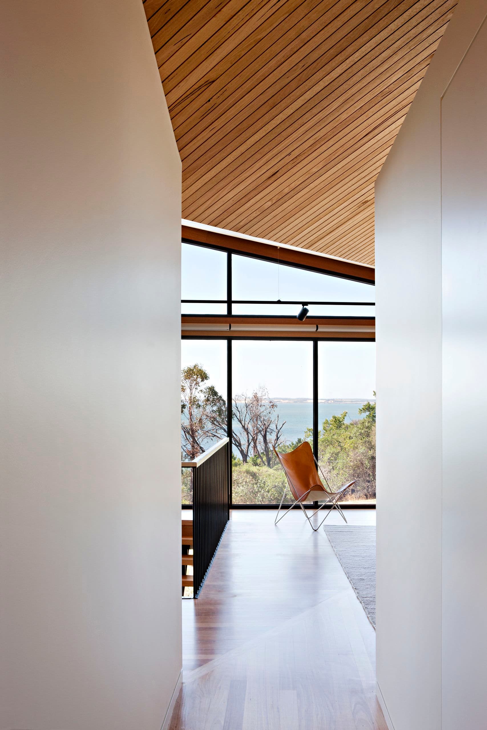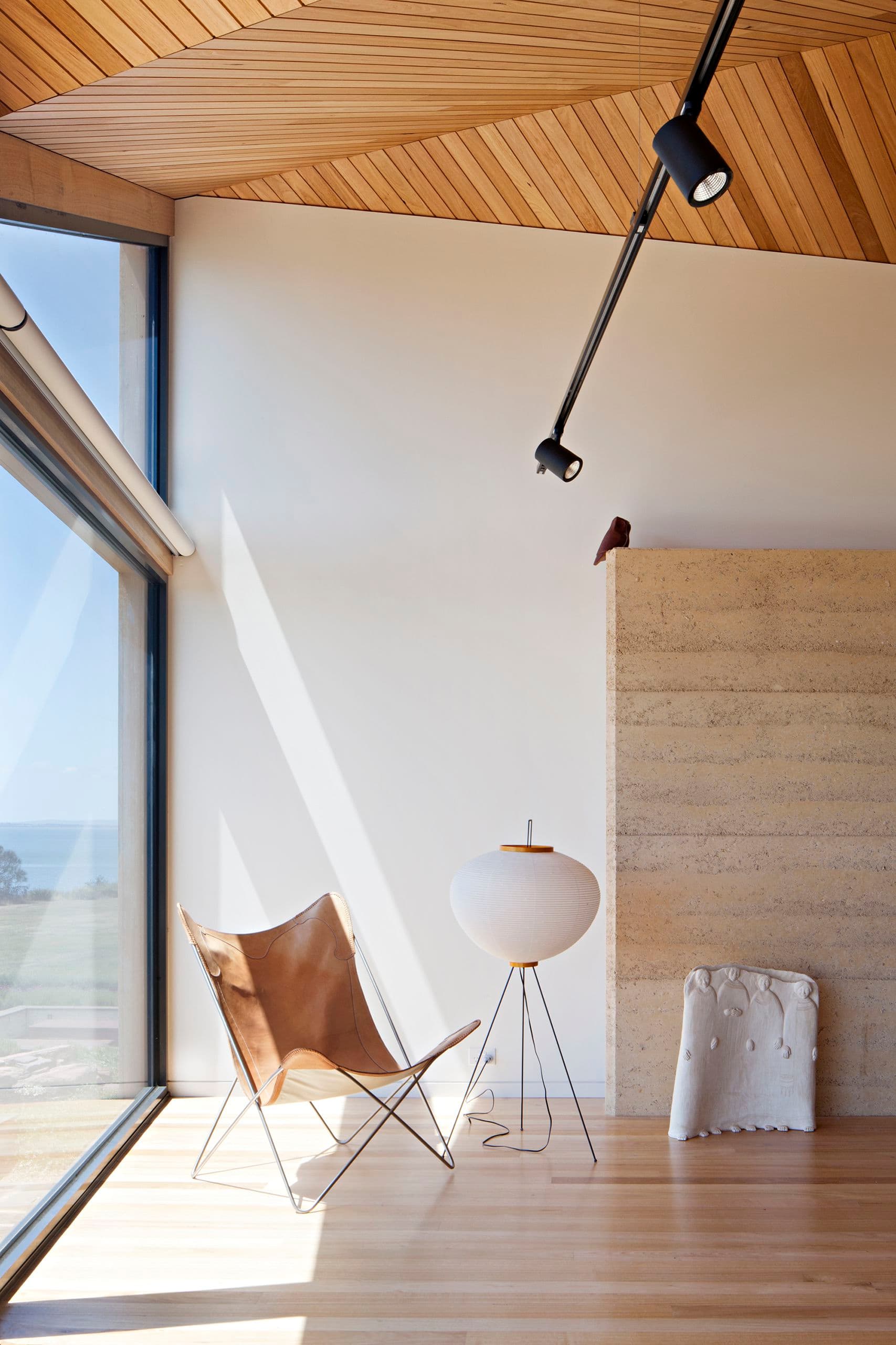 Programmatically the ground floor defers to vernacular type, small functional bedrooms and utilities alongside open and indeterminate spaces that expand and contract with the varying accommodation demands of a family coastal home. Sliding timber walls offer spatial flexibility within the overall logic of the immutable earth walls.